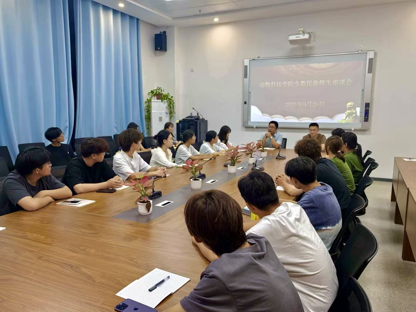 为深入贯彻落实习近平总书记关于铸牢中华民族共同体意识的重要指示精神,进一步加强学院与少数民族学生的交流,关心关爱学生成长,9月26日晚,动物科技学院在动科大楼201会议室召开2025级新生少数民族学生代表师生座谈会。动物科技学院党总支副书记洪渊参加会议,会议由学工办负责人张晓华主持。
