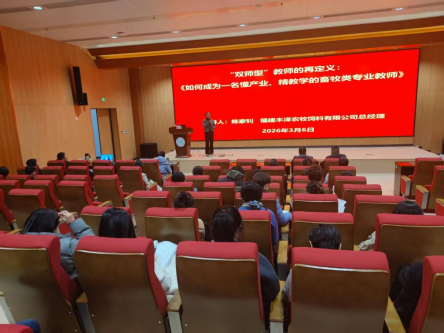 3月6日下午,福建丰泽农牧饲料有限公司总经理陈家钊应邀莅临动物科技学院作题为《“双师型”教师的再定义:如何成为一名懂产业、精教学的畜牧类专业教师》的专题讲座。讲座由韩云珍院长主持,全体专任教师参加。