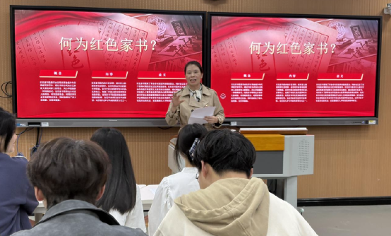 活动伊始,李素枫老师以“什么是红色家书”为切入点,明确其核心定义并非信笺颜色,而是革命先辈在战争年代与家人通信的特殊载体,承载着家国大义与精神力量。她结合历史背景补充说明,革命年代家书传递困难,每一封都历经艰险,因此更显珍贵,为后续的家书故事分享做好了情感与认知的铺垫,迅速将师生们的思绪带入那段红色的历史岁月中。