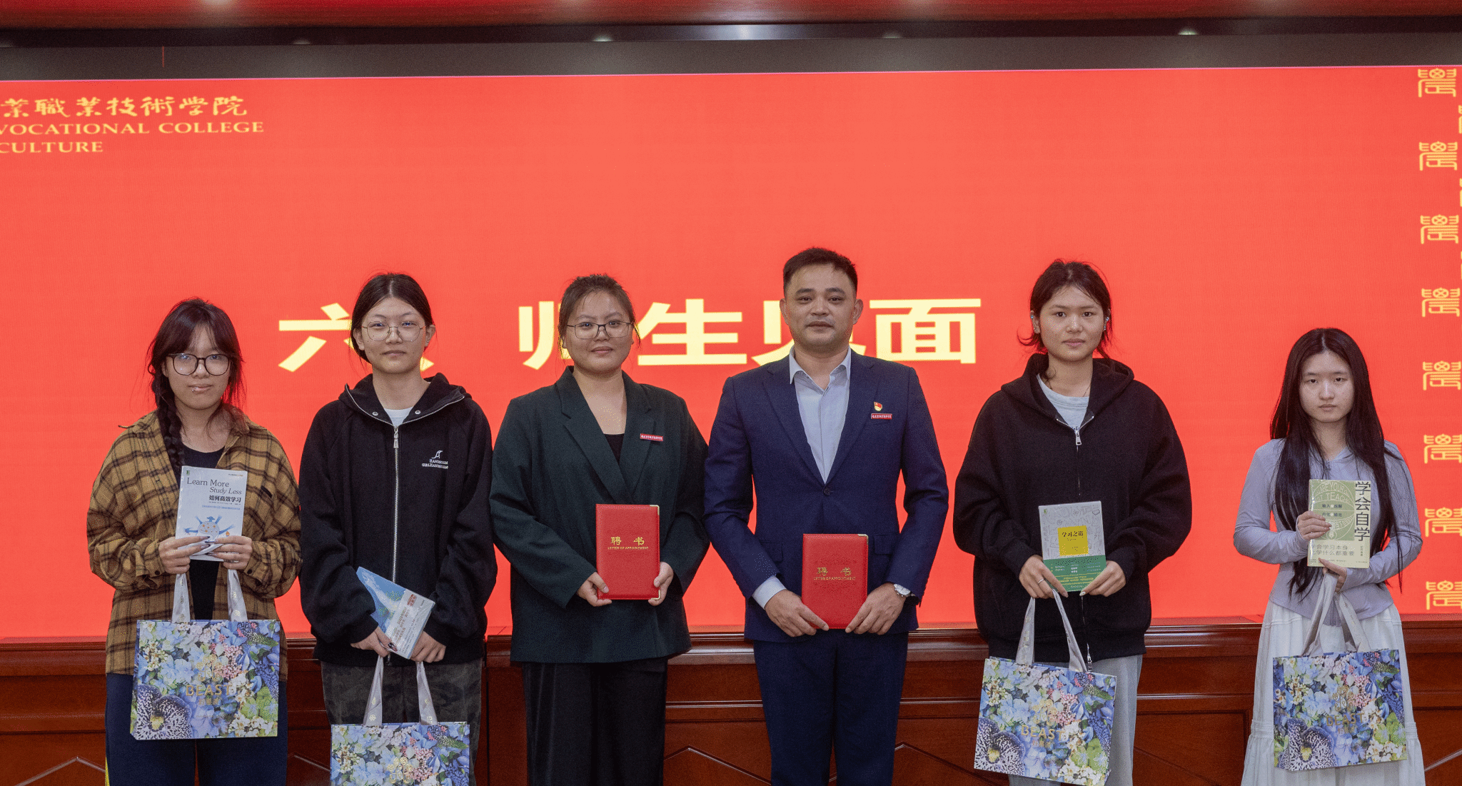 聘书授予环节氛围庄重而热烈。林俊标为全体党员导师与专业导师郑重颁发聘书,一纸聘书承载着育人重任,彰显着学院对人才培养的高度重视。学生们分组有序登台,向导师行拜师礼,导师们则为学生送上精心筹备的成长礼,躬身行礼间传递着治学之道,互赠心意中凝聚着师生深情,生动诠释了薪火相传的教育情怀与立德树人的育人初心。