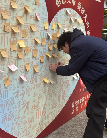 除了制作并传递拗九粥外,学生宿舍11号楼下还开展了“孝心卡”制作及感恩送祝福活动,老师及学生们纷纷在卡片上写下对父母、对长辈的祝福与感恩,并将孝心卡贴在心愿墙上。一张张卡片承载着同学们真挚的情感,表达了对长辈的敬爱与感激之情。