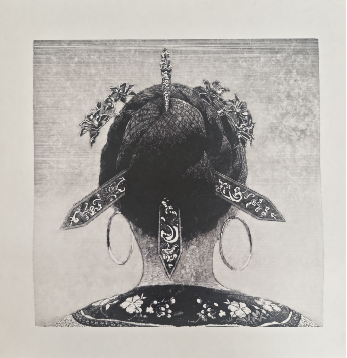 除烟台山建筑外,福州非遗 “三把刀” 妆造也成为创作灵感来源。“三把刀” 妆造是福州传统梳妆技艺,动画设计制作专业郑芯慧同学在充分了解其文化内涵与造型细节后,开启版画创作。