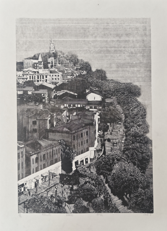 此次精品班创作题材从校内转向校外,福州烟台山建筑景观成为重点创作对象之一。烟台山见证福州近现代历史变迁,哥特式、罗马式、巴洛克式等风格建筑在此交相辉映,形成独特风景线。为更好表现建筑特色,社员多次自发前往烟台山采风:他们穿梭街巷,手持速写本与相机,细察建筑结构、窗棂纹样与光影变化。雷令金站在百年老洋房前,被其精美浮雕与尖顶设计吸引,一边用铅笔勾勒轮廓,一边标注明暗区域:“窗台阴影要深,用圆刀刻密集线条;墙面肌理用平刀轻刮,表现石材质感。” 返校后,檀老师悉心指点:“还要注意建筑透视,远处钟楼线条要轻,用留白突出距离感。” 新社员围坐交流观察心得,记录打动自己的细节,为后续刻制积累素材。