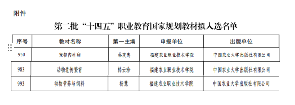 近日,教育部正式公示第二批“十四五”职业教育国家规划教材名单,拟确定2966本教材为第二批“十四五”职业教育国家规划教材。我院蔡友忠教授主编的《宠物内科病》、韩云珍教授主编的《动物遗传繁育》、杨慧教授主编的《动物营养与饲料》3本教材入选榜单。