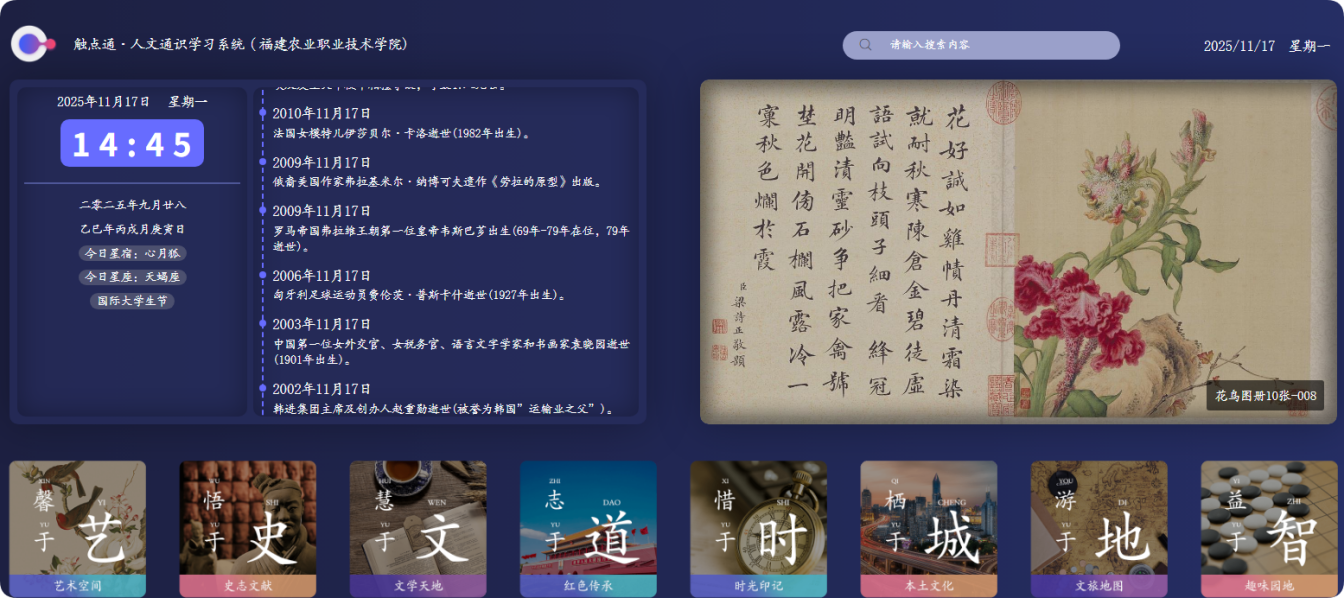 基于云存储与大数据技术构建的数字人文资源库,包含8大板块、60余个子栏目,总量达1600万条目、24000Gb。特色模块“龙脉书典”收录15.9万矢量字模及6962位历代书家作品,支持单字/书家/时代三维检索;“文旅地图”集成48万幅高清艺术作品(含梵高《星月夜》原作级数字典藏),实现虚拟展馆沉浸式漫游。该系统已被多所高校纳入通识教育体系,助力学生构建跨学科知识网络。