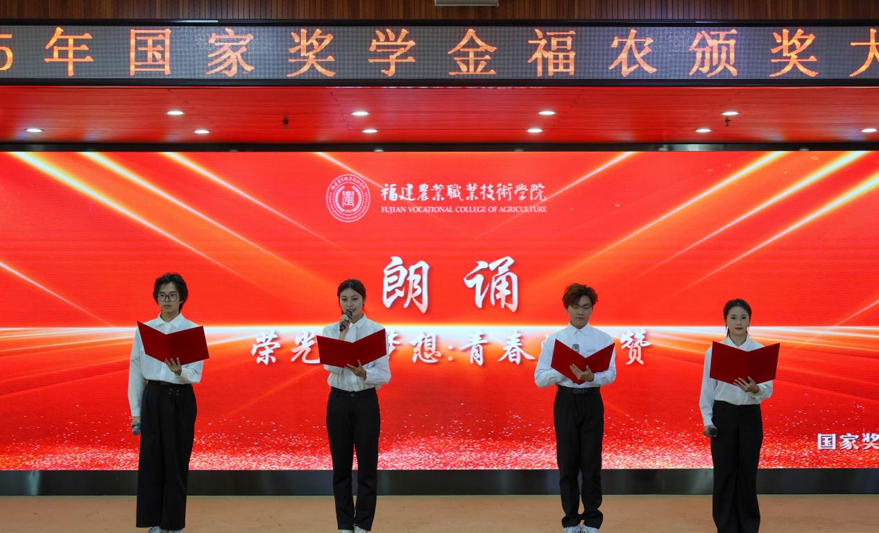 大会在庄严的国歌声中启幕。赵文杰等4名获奖学生代表共同朗诵诗歌《荣光与梦想:青春的礼赞》,以真挚情感抒发对祖国的赤诚与青春的担当,赢得全场阵阵掌声。颁奖环节,获奖学子依次登台,从与会领导手中接过荣誉证书。这些证书的背后,是他们求学途中日夜兼程、勤学苦练的见证,每位获奖者的故事,都是福农学子勤勉学习、踏实前行、勇于争先的鲜活体现。