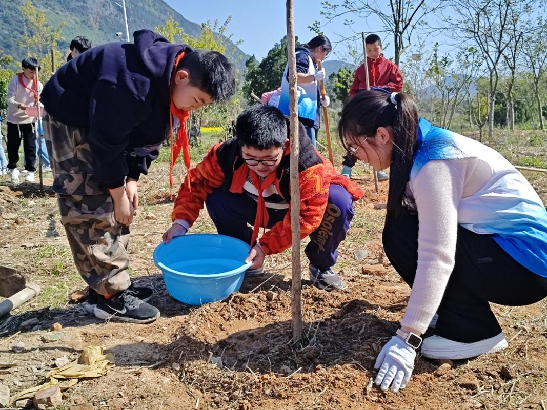 活动现场,党旗飘扬,气氛热烈。大学生承担挖坑培土,小学生扶苗浇水,“大手拉小手”共植新绿,呈现出热火朝天的劳动景象。一个多小时后,百余株树苗迎风挺立,生机盎然,为春日校园增添一道亮丽风景。孩子们将写有自己名字和心愿的树牌悬挂在亲手栽种的树苗上,“愿小树和我一起快乐长大”“绿水青山,伴我成长”等质朴话语寄托着对美好未来的无限憧憬,也彰显了新时代青少年投身生态文明实践的思想自觉和行动自觉。