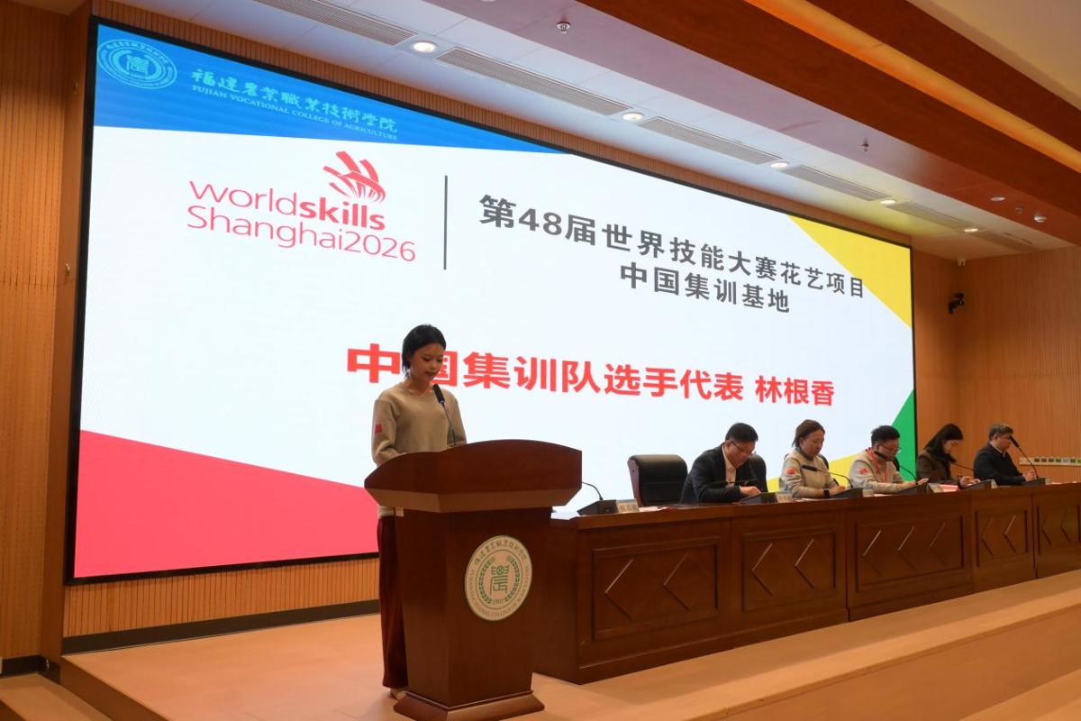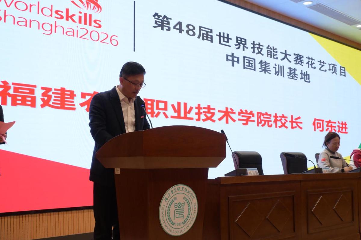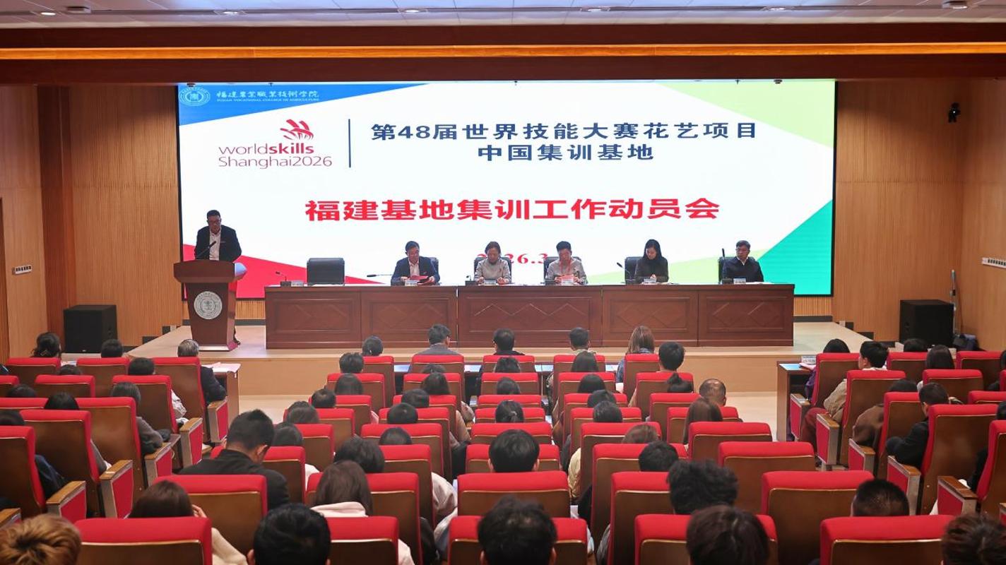 2026年3月16日,第48届世界技能大赛花艺项目中国集训基地(福建基地)集训工作动员会在我院举行。福建省人社厅职业技能鉴定指导中心副主任陈燕,第48届世赛花艺项目中国技术指导专家组组长朱迎迎、教练组组长项一鸣,上海建设管理职业技术学院校长李海伟,副校长凌敏,福建农业职业技术学院院长何东进,副院长侯志宏等领导嘉宾出席动员会,世赛花艺项目中国国家队全体教练、队员,以及福建农业职业技术学院教务处、园艺园林学院相关负责人、师生代表和志愿者参加活动,动员会由侯志宏主持。