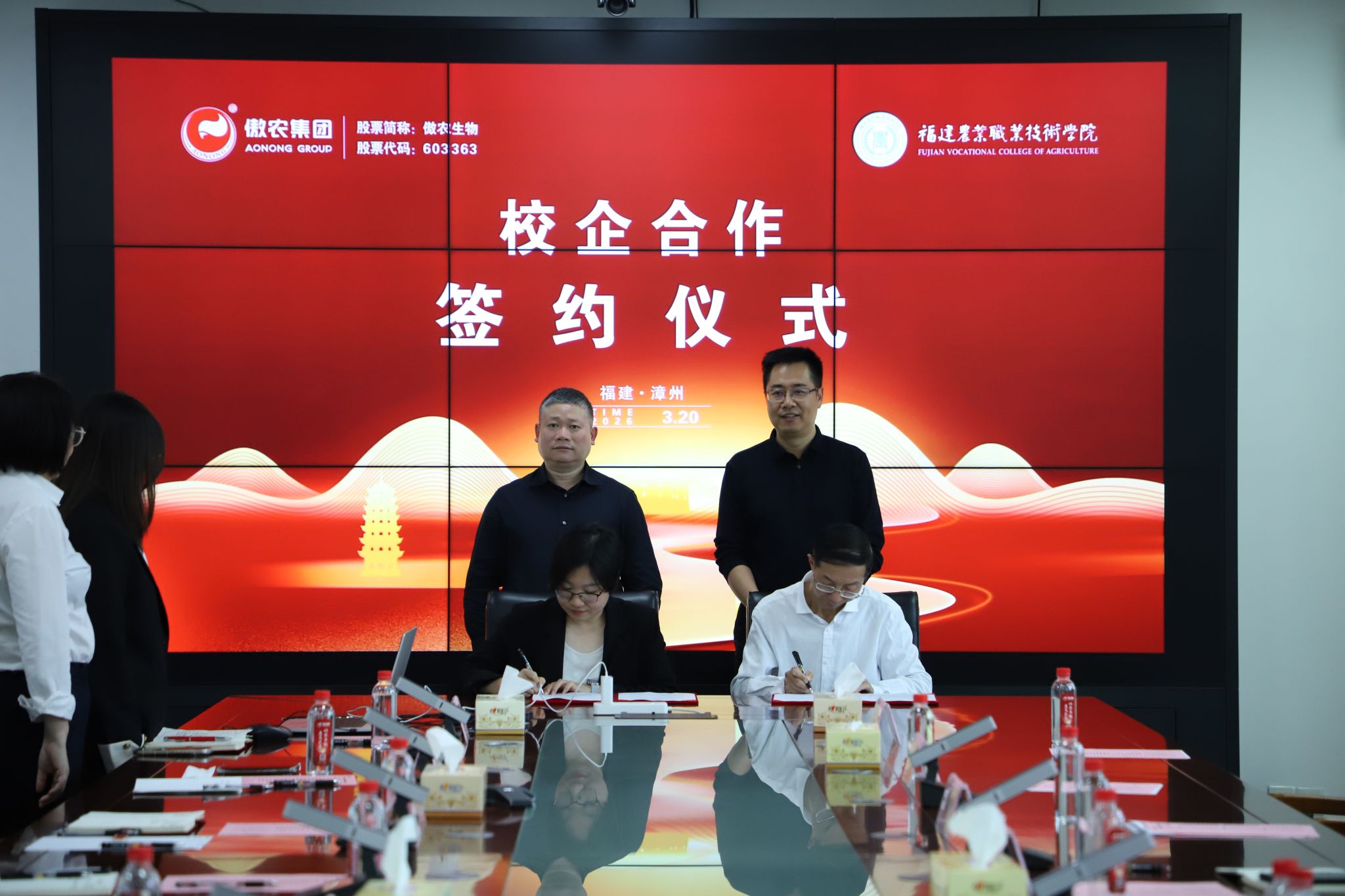 在傲农集团,杨振坦考察企业研发中心,与企业回顾合作历程,洽谈科研攻关、毕业生招聘等事宜,推动校企合作向“育人共同体”升级。当日,“傲农订单班”签约仪式在傲农集团漳州科技园举行。杨振坦与傲农集团副董事长、总经理吴有林共同见证校企双方签署合作协议,双方将围绕人才共育、课程共建等开展深度合作。