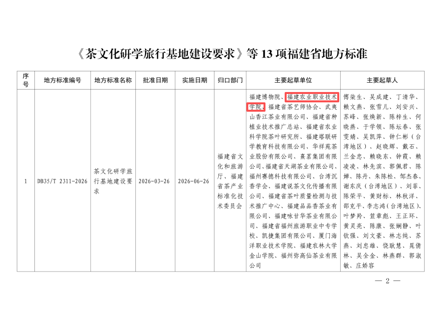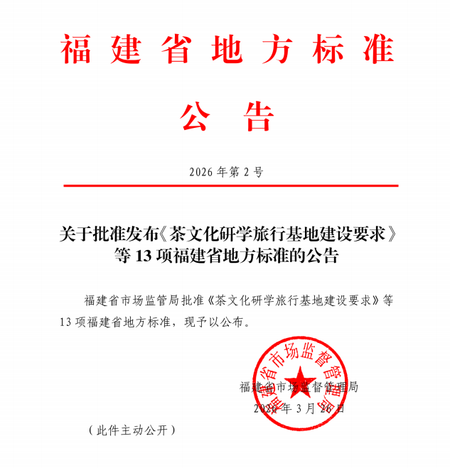 近日,福建省市场监督管理局正式发布地方标准《茶文化研学旅行基地建设要求》(DB35/T 2311-2026)。该标准由福建博物院牵头,我校作为主要起草单位之一深度参与研制,系全国首个专门针对茶文化研学旅行基地建设的综合性技术规范,也是我省首个横跨文化、旅游、茶产业三大领域的推荐性地方标准,标志着我省“福茶研学”迈入标准化、规范化发展新阶段。