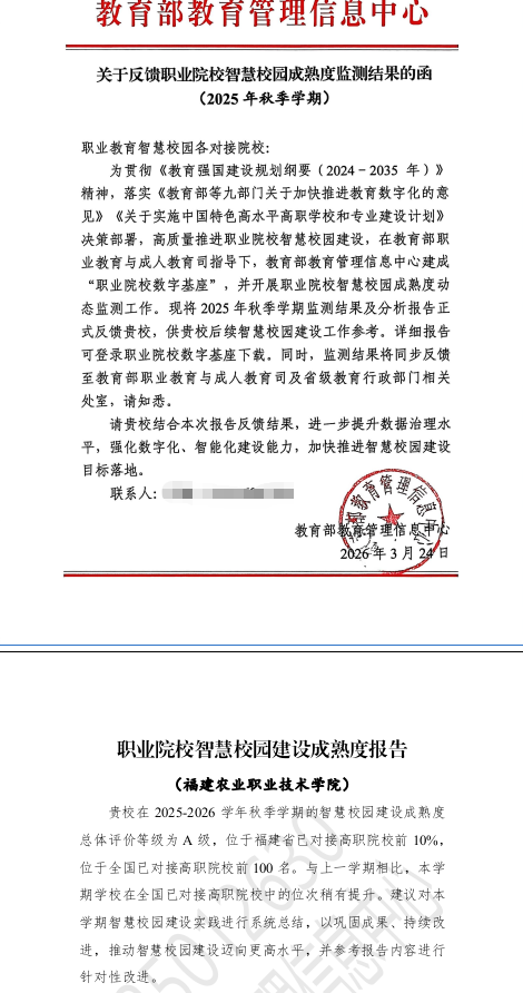 近日,教育部教育管理信息中心正式发布2025-2026学年秋季学期职业院校智慧校园建设成熟度监测结果,我院凭借扎实的数字化建设基础、突出的应用成效,在全国数千所参评职业院校中脱颖而出,智慧校园建设成熟度获评A级(最高等级),跻身全国已对接高职院校前100名。