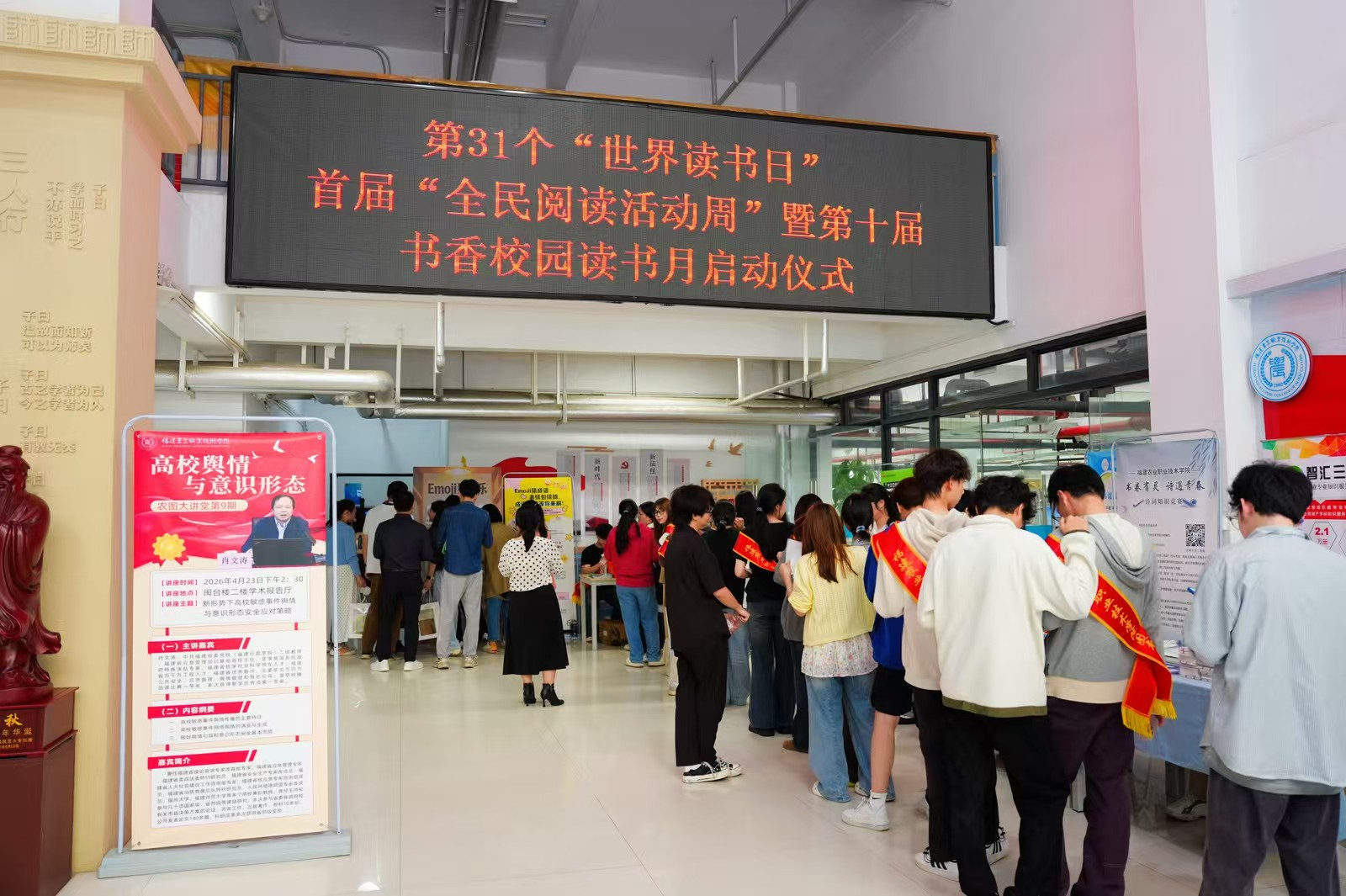 春深日暖,书香氤氲。2026年4月23日上午,由图书馆主办的以“AI赋能书香,数智点亮校园”为主题的第31个“世界读书日”、首届“全民阅读活动周”暨第十届书香校园读书月系列活动启动仪式在闽台楼二楼学术报告厅隆重举行。学院党委书记杨振坦、副书记王振亮、副院长严挺文,以及相关部门、二级学院负责人与师生代表共200余人出席活动。