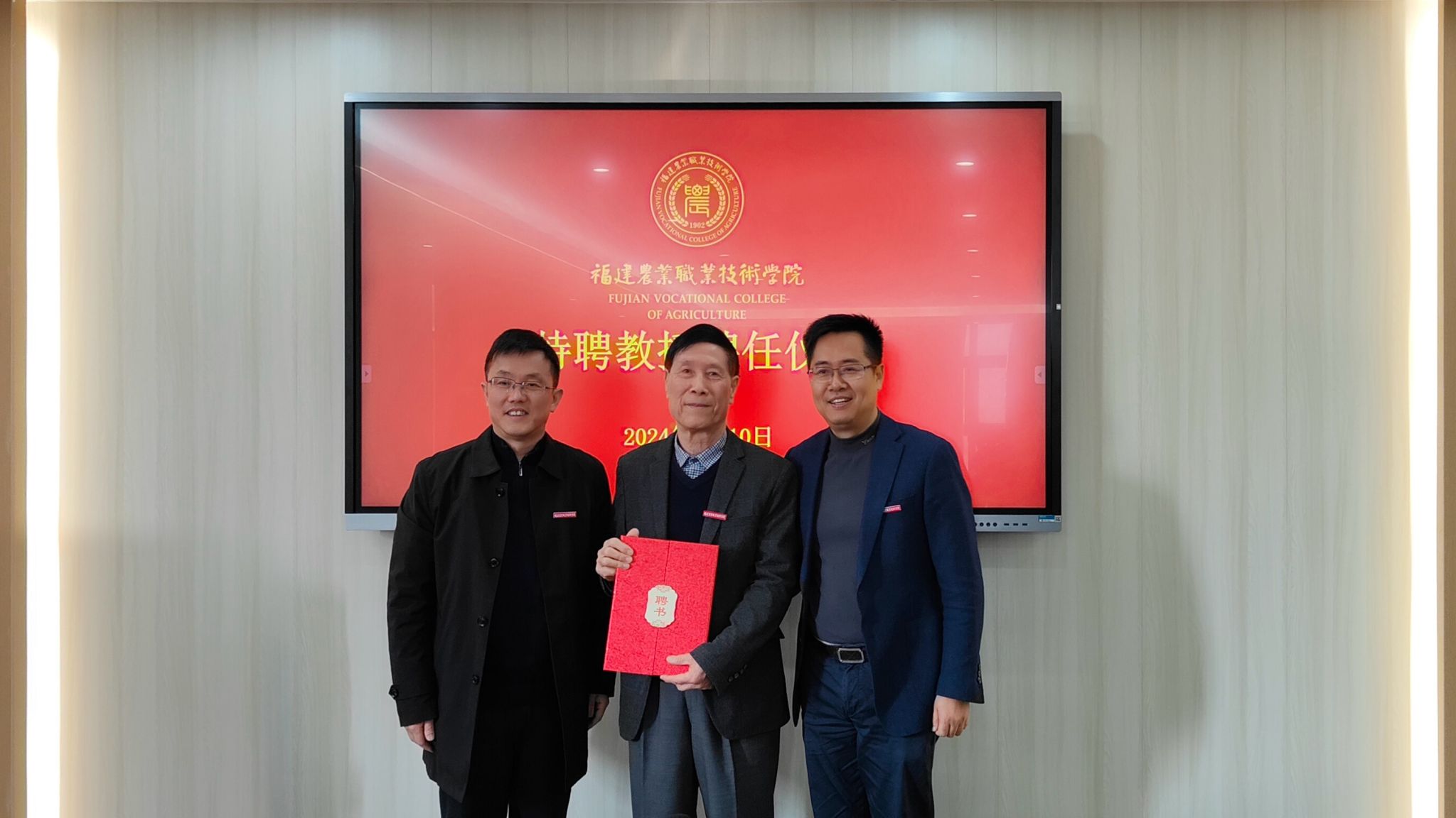会前,校党委杨振坦书记为孙芳仲教授颁发了福建农业职业技术学院“思政特聘教授”聘书,何东进校长为孙教授佩戴了校徽。