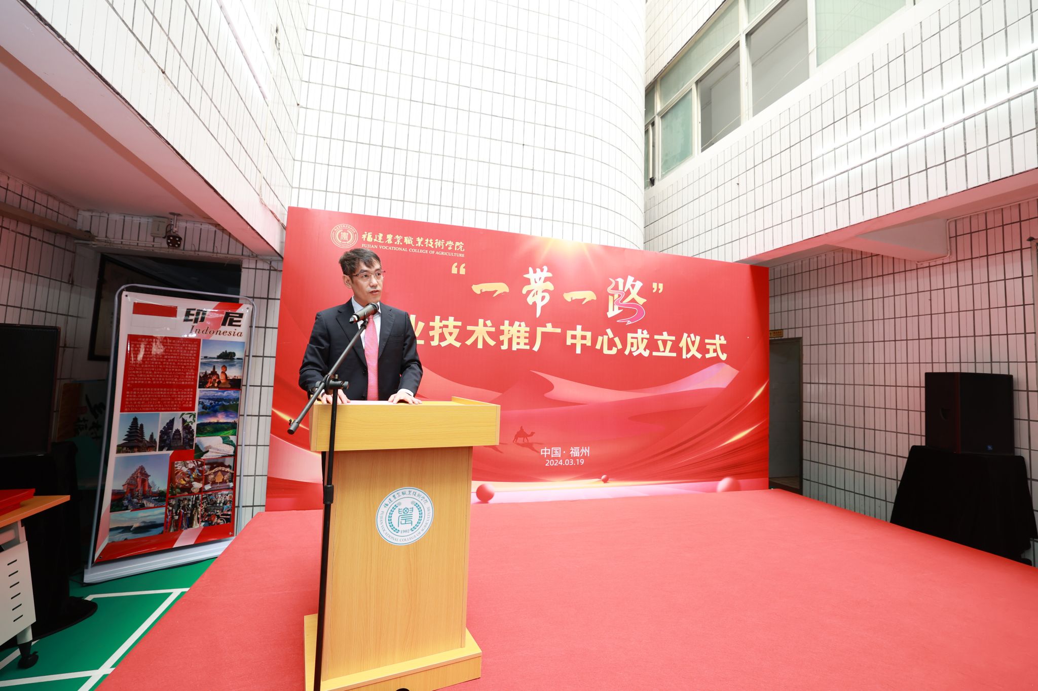 3月19日,福建农业职业技术学院“一带一路”农业技术推广中心在学院首山校区正式成立。省侨联主席陈式海,省委教育工委、省教育厅二级巡视员黄荣光,省农业农村厅二级巡视员张敏岩,省农科院副院长魏辉以及“一带一路”沿线国家的企业嘉宾与学校师生代表近百人出席揭牌仪式。揭牌仪式由校长何东进主持。