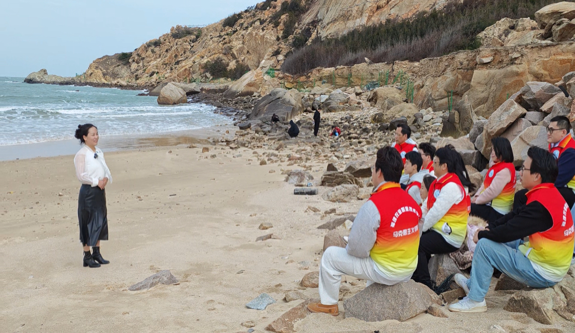 海浪为伴,沙滩作席。马克思主义学院副院长连淑娇的微课伴着海浪声开讲:“妈祖立德、行善、大爱的精神跨越海峡,成为两岸同胞共同的文化基因。今天我们来到这里,就是要思考,作为青年,如何让这条精神纽带更加牢固?”