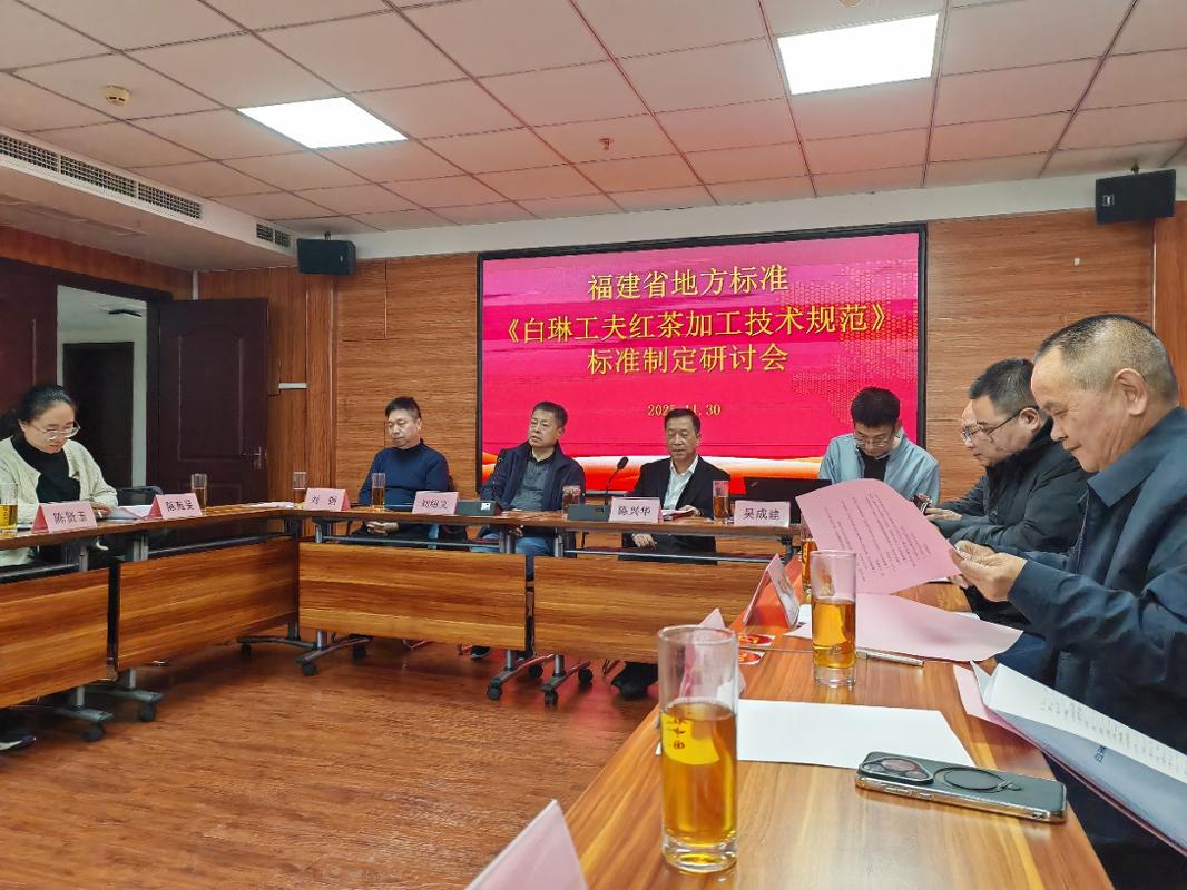 2025年11月30日,福建省地方标准《白琳工夫红茶加工技术规范》制定第一次全体会议在福鼎市茶业协会会议室隆重召开。会议由福建省茶产业标准化技术委员会牵头组织,汇聚茶产业领域专家学者、标准起草单位代表及行业骨干企业负责人,共同研讨标准框架内容、明确任务分工,为规范白琳工夫红茶加工工艺、推动产业高质量发展奠定坚实基础。我院作为该标准主要参编单位,派出茶专业专任教师、省技能大师工作室领办人、高级工程师吴成建代表学院参会,积极助力闽红产业标准化建设。
