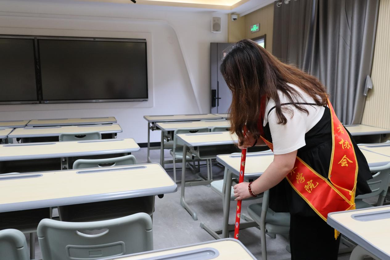 第五小组深入教学一号楼,开展教室清洁行动。学员们逐个检查课桌抽屉,清理残留的废纸、饮料瓶,整理散乱的粉笔、黑板擦,并将讲台物品归置整齐。细微之处的用心服务,让教室焕然一新,为师生营造了舒心的学习空间。