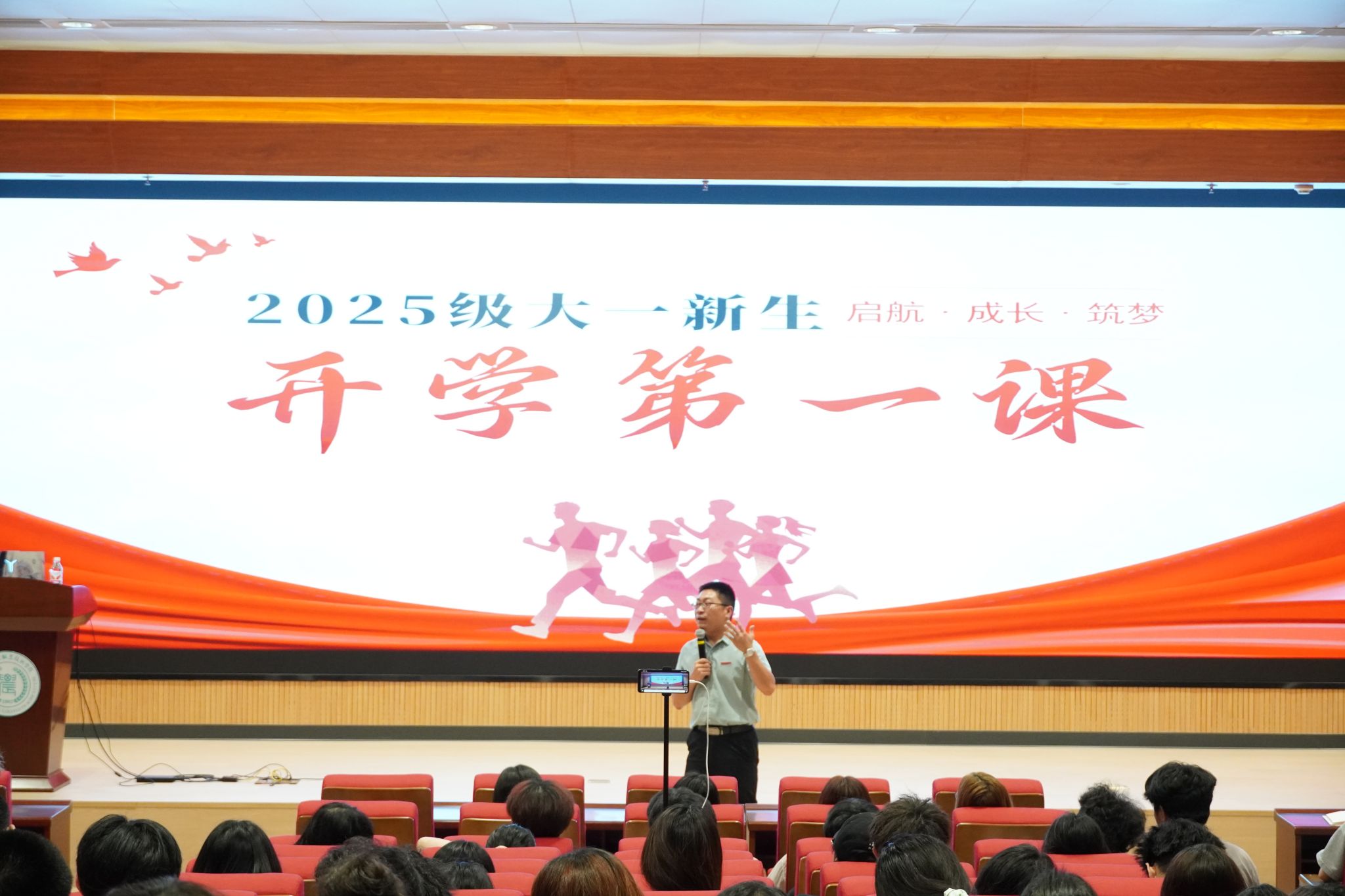 理想信念教育作为新生入学教育的重要环节。活动伊始,动物科技学院党总支书记余勋信以 “牢记抗战历史,弘扬抗战精神”为题,为全体新生讲授开学第一课。余书记从中华民族艰苦卓绝的抗战历程讲起,指出十四年抗战是无数先烈用生命和热血铸就的历史丰碑,是中华民族宝贵的精神财富,至今依然闪耀着时代光芒。他勉励大家,既要“向下扎根”—沉下心来夯实专业基础、锤炼实用技能;也要“向上生长”—弘扬抗战精神,胸怀祖国,在建设教育强国与民族复兴的伟大征程中,书写精彩的青春篇章。