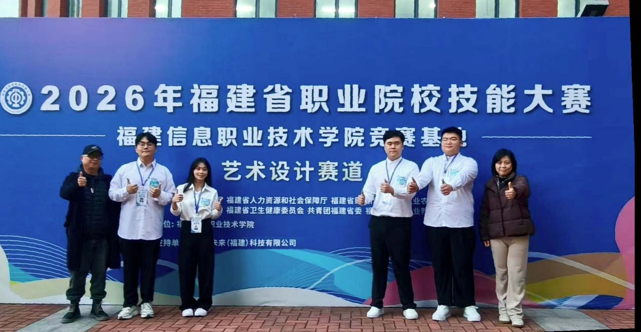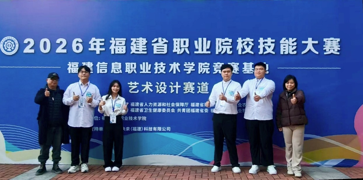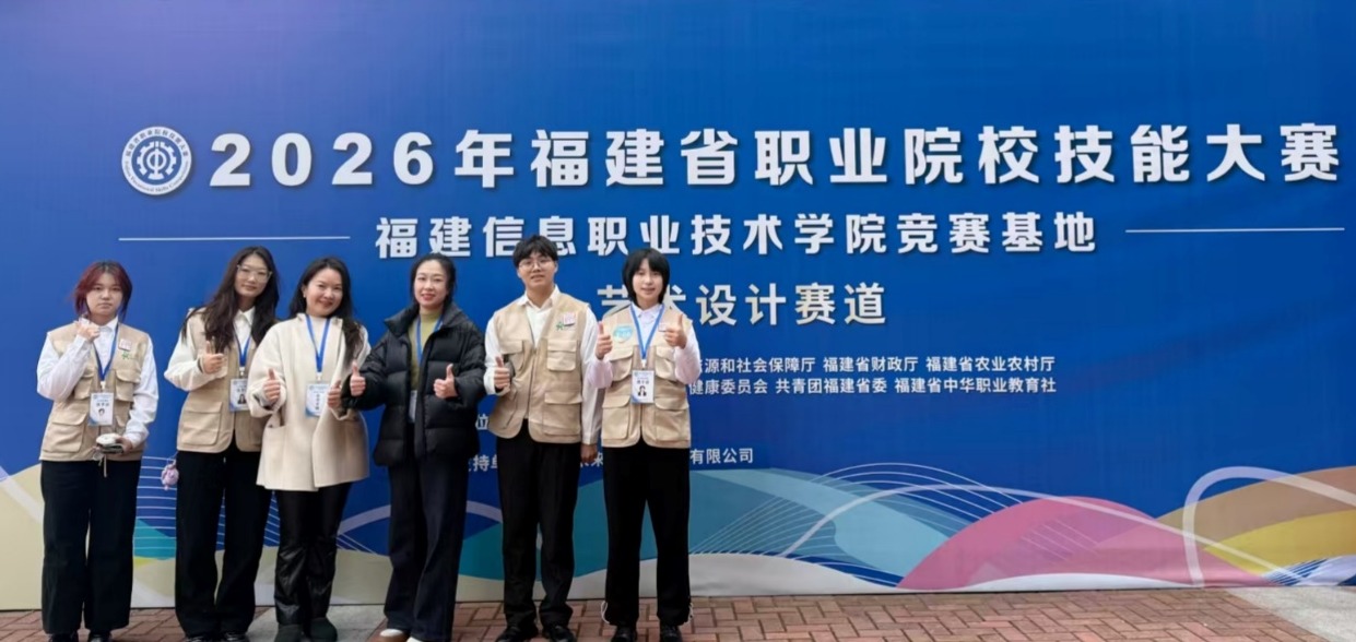 2026年度福建省职业院校技能大赛“艺术设计赛道”于12月25日-29日在福建信息职业技术学院成功举办,来自全省40所高职院校的76支参赛队伍同台竞技。二轻学院于舒婷老师、李宏老师指导的一队(参赛学生:肖玥琪、王焕杰、黄天铖、翁梓华)、二轻学院丁玎老师、园艺园林学院黄文婷老师指导的二队(参赛学生:雷令金、李欣蔓、吉鑫、胡懿恬),双双荣获银奖(分列第2名、第3名)。