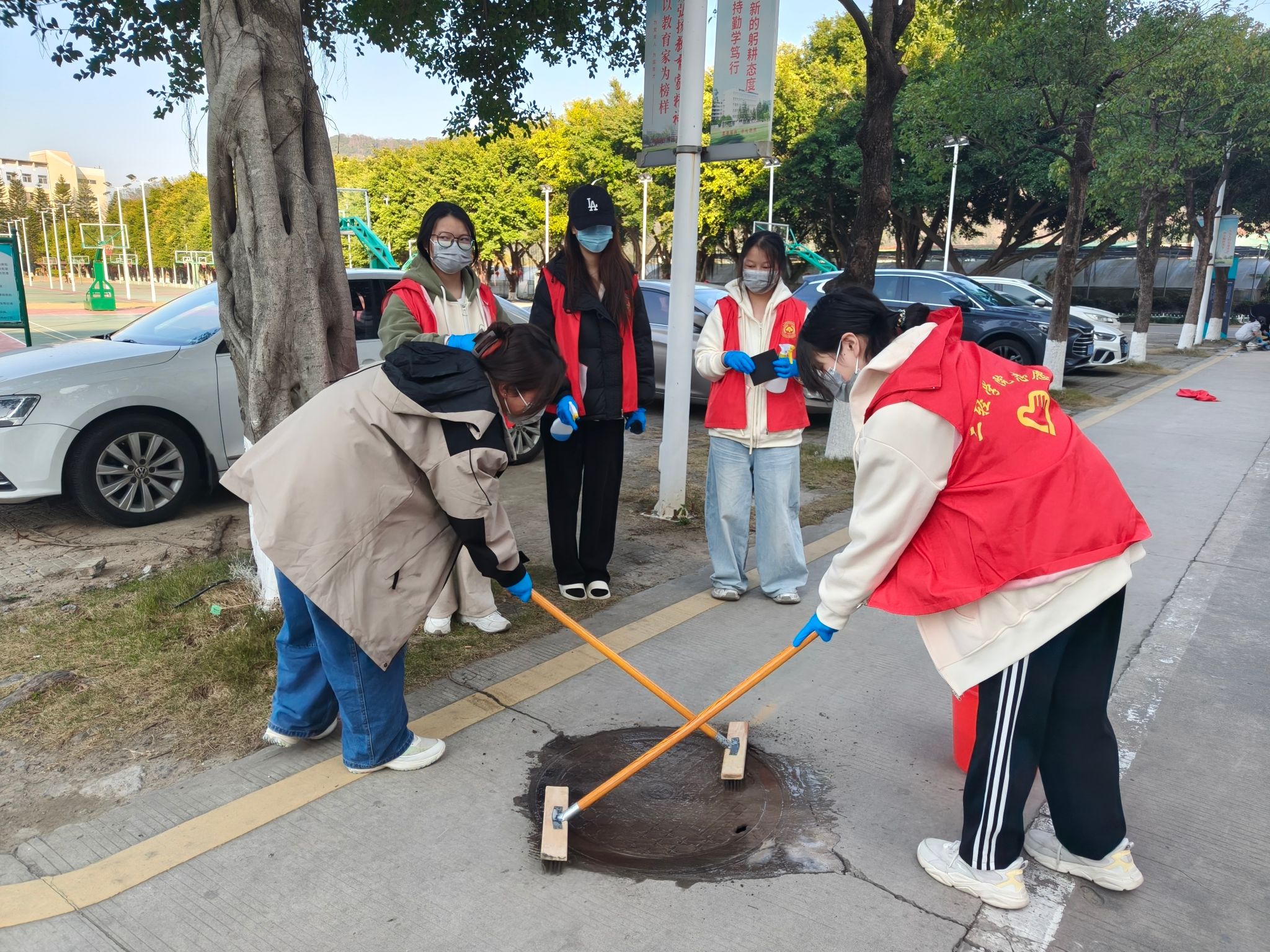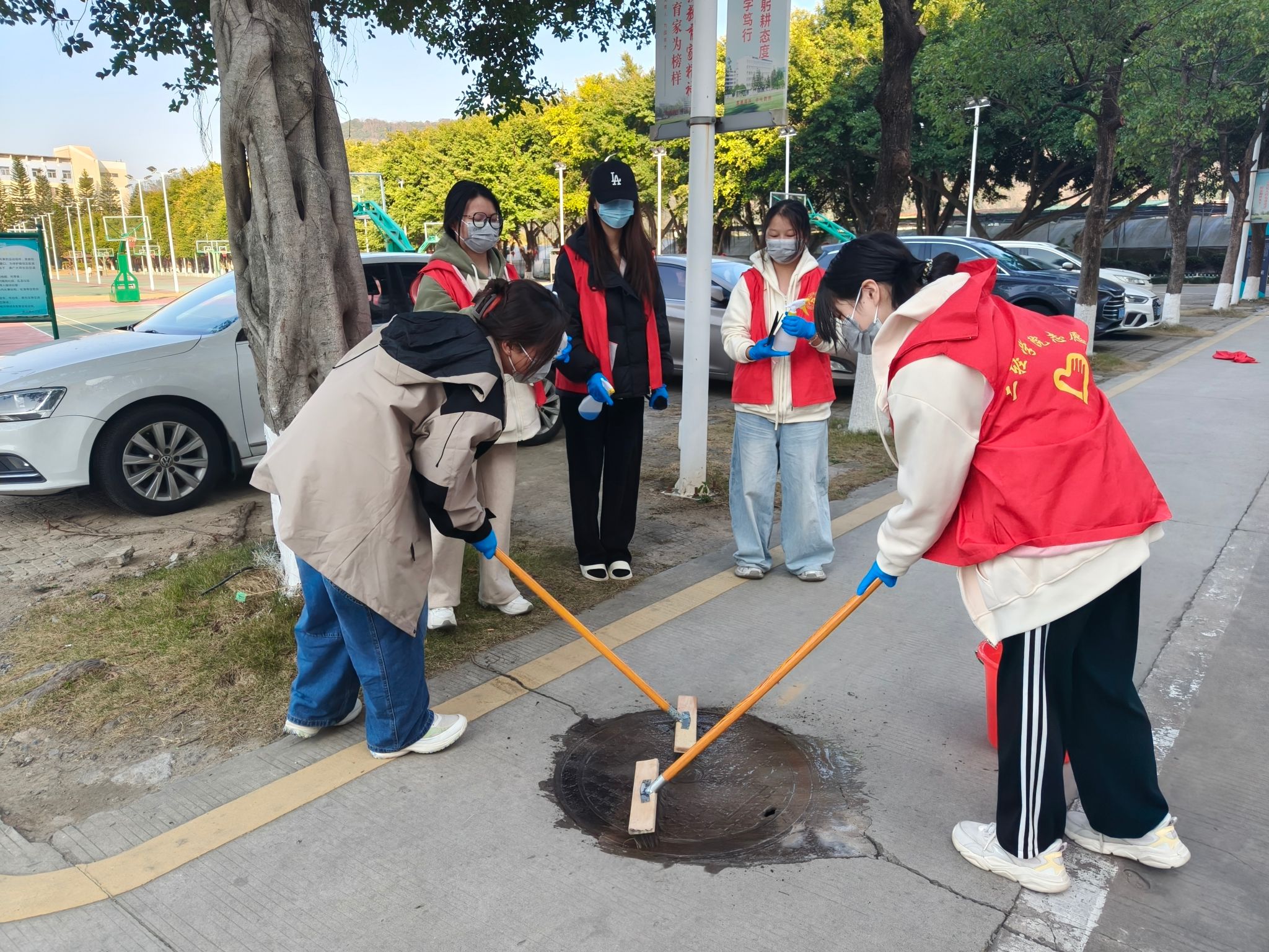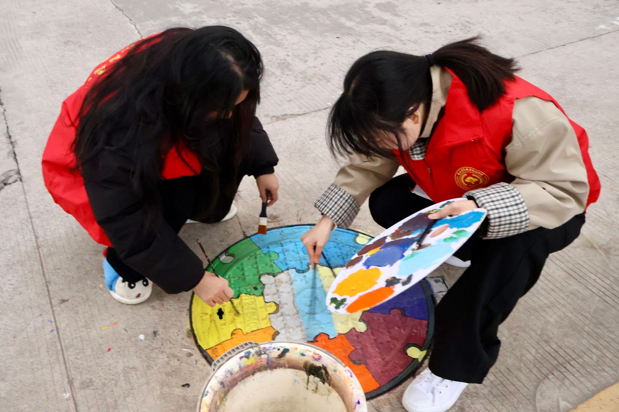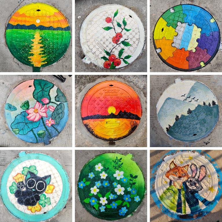创作环节,志愿者们手持画笔勾勒线条、填充色彩,认真专注的模样成为校园里一道独特的风景线。灵动的卡通形象、醒目的文明标语、雅致的山水图案……经过同学们的精心描绘,一个个普通的井盖变成了一幅幅生动有趣的“艺术品”,为校园增添了别样生机。