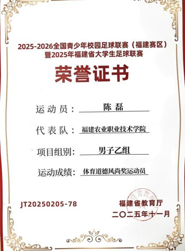 由福建省教育厅主办的2025-2026全国青少年校园足球联赛(福建赛区)暨2025年福建省大学生足球联赛圆满落幕。我校代表队奋勇拼搏,表现优异,麦如普江·牙生江、陈磊两位同学凭借在赛场上的卓越风采与高尚体育精神,荣获“体育道德风尚奖运动员”称号。