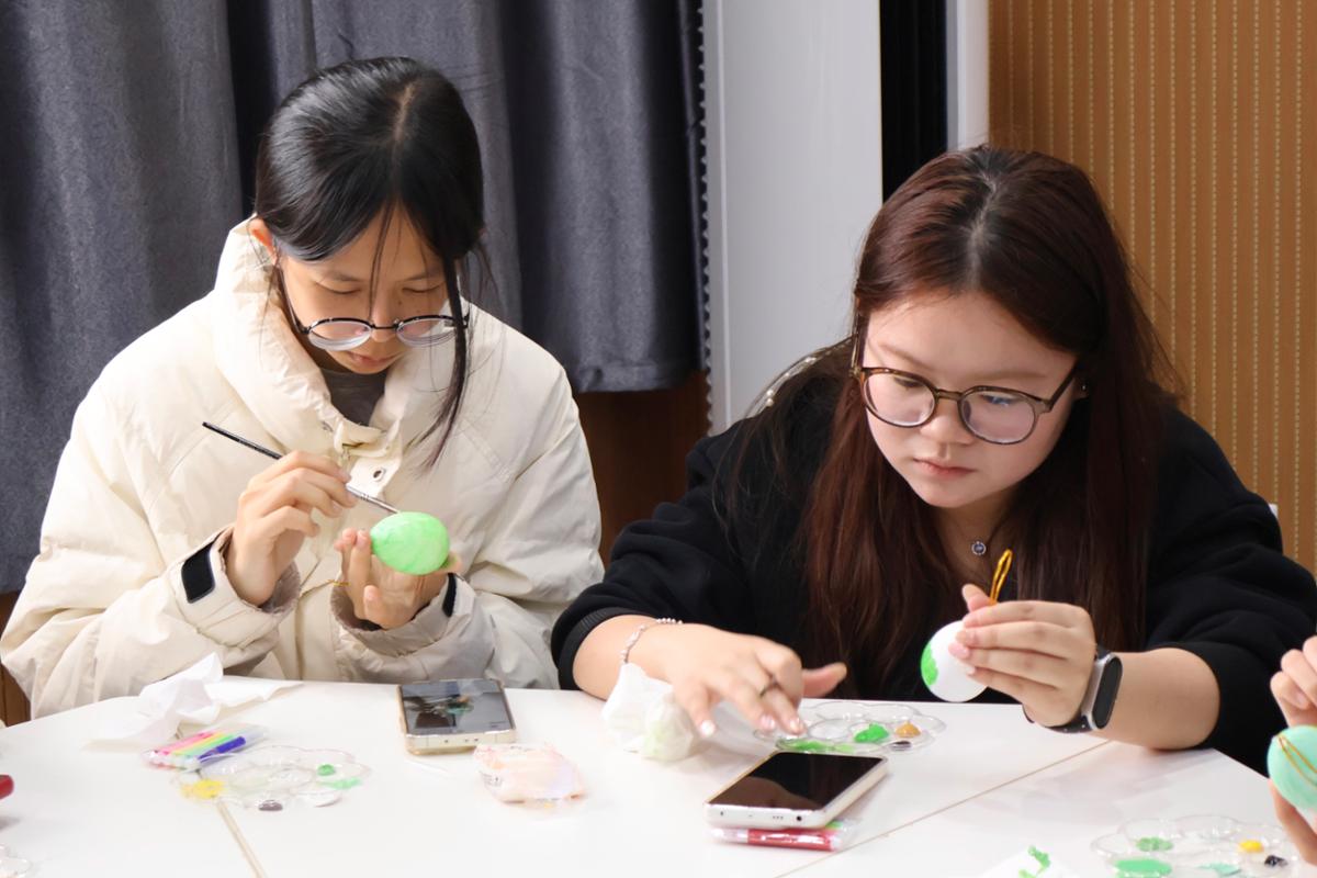 春分是万物复苏的时节,也是民间“立蛋”“画蛋”的传统时节。活动现场,同学们有序领取蛋壳、颜料等材料,充分发挥想象力,将春分节气元素与个人巧思相结合,在蛋壳上精心勾勒、上色,将对春日的喜爱与对传统文化的理解融入笔尖,一个个普通的蛋壳在巧思妙想下变身成色彩斑斓、创意十足的艺术作品。