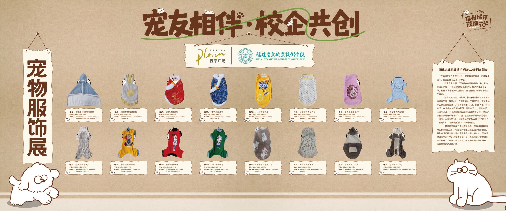 为进一步彰显办学特色、深化校企合作、扩大社会影响力,4月18日至19日,二轻学院组织师生走进福州市首个“宠物友好型街区”福州苏宁广场,参加福州城市溜溜节,并携手街区开展宠友相伴,校企共创主题宠物服饰展,以专业设计赋能宠物“它经济”,充分展示服装与服饰设计专业育人成果与专业风采。