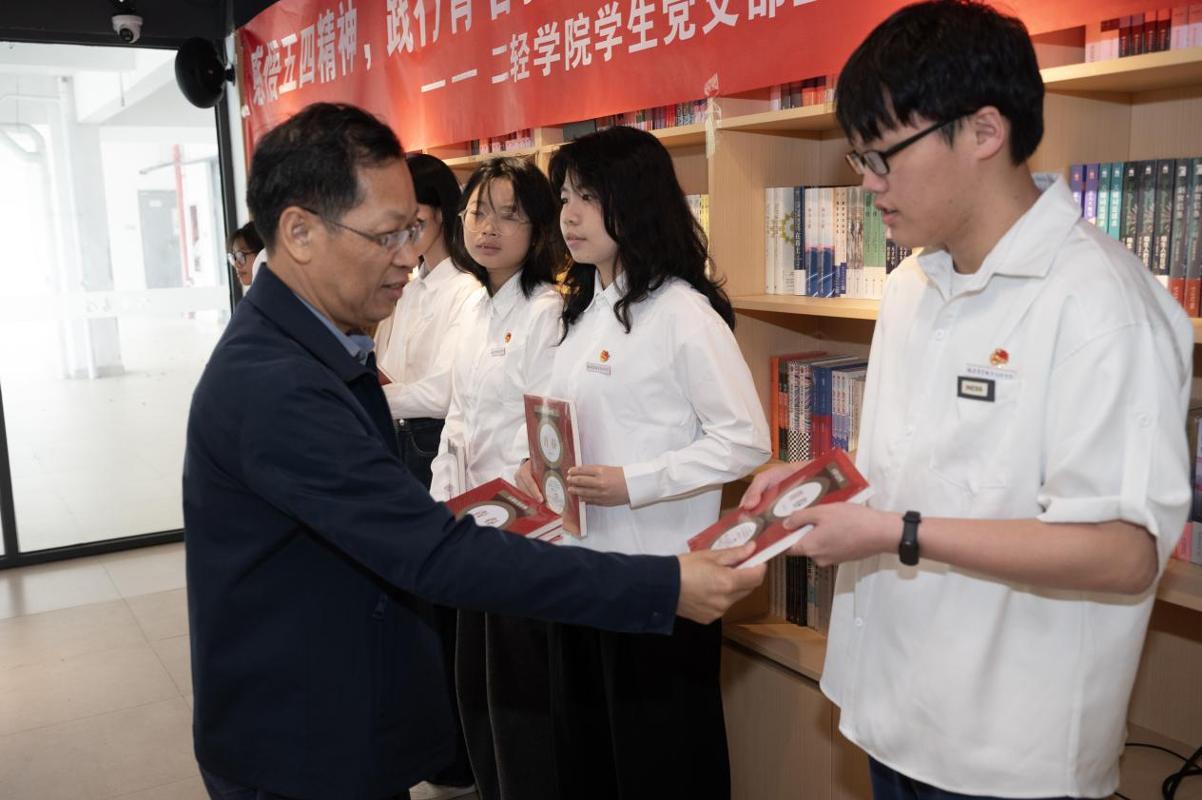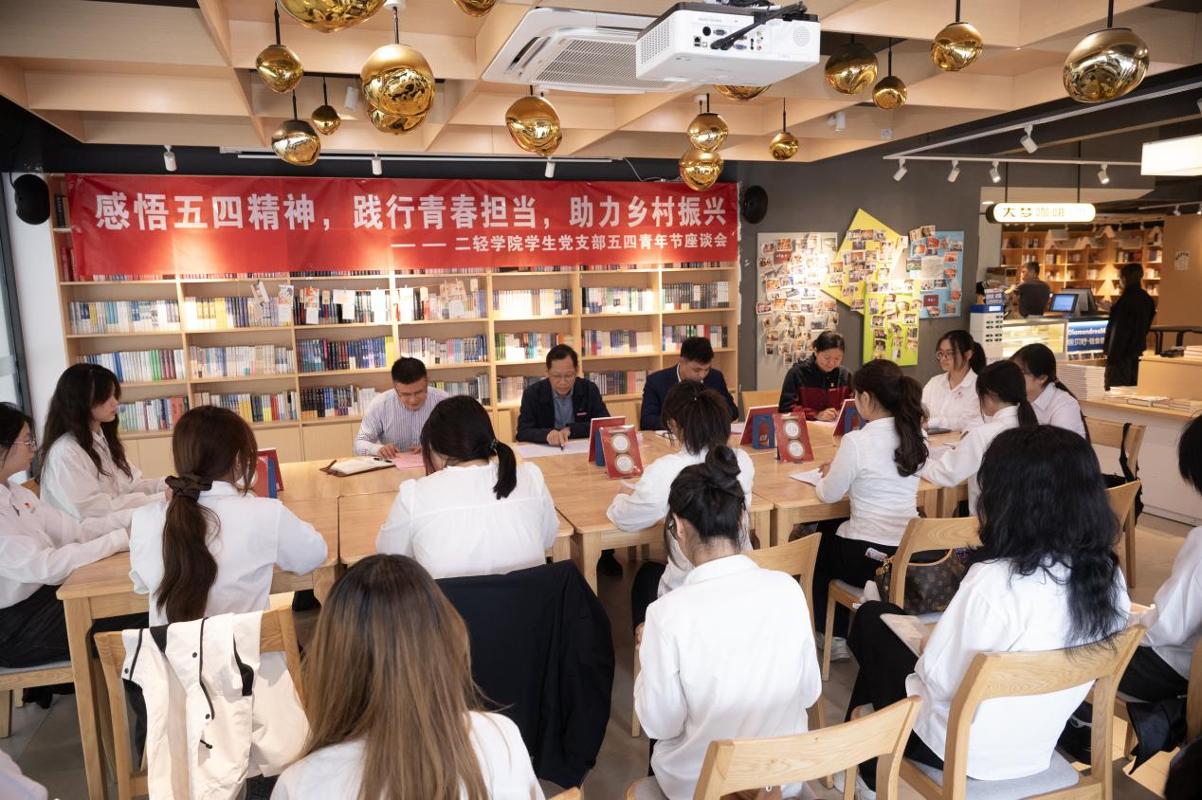 4月24日上午,二轻学院学生党支部在相思岭校区大梦书屋举办“感悟五四精神、践行青春担当、助力乡村振兴”五四青年节主题座谈会。校党委副书记王振亮,学院党总支副书记张一宁及学院党支部党员、全体入党积极分子参加座谈。