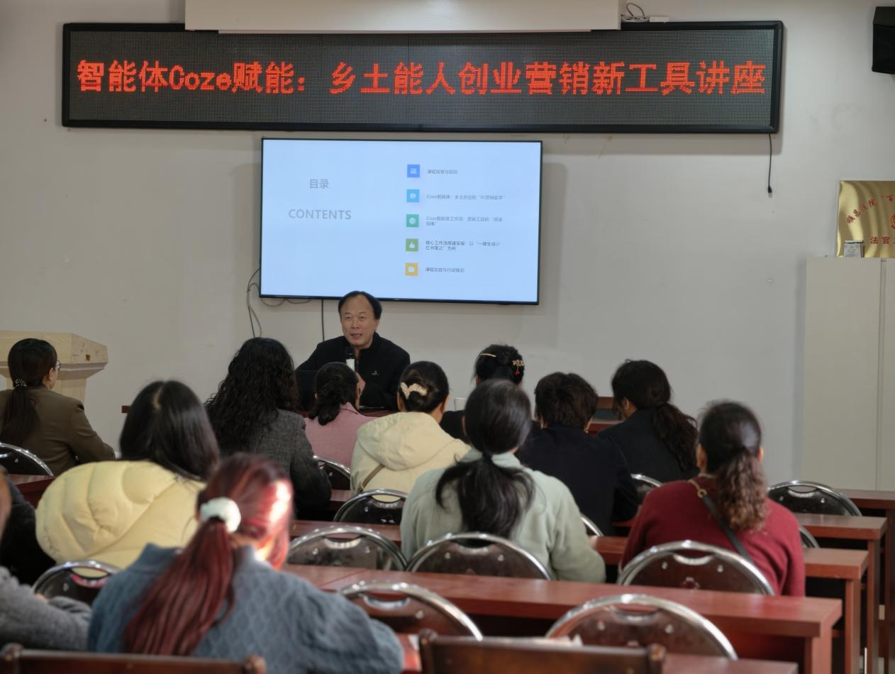 下午,在顺昌县妇联主席陈晓红的组织下,马风棋教授围绕《智能体Coze赋能:乡土能人创业营销新工具》主题开展专题讲座,邀请当地农业企业从业者、乡村干部、农户代表参与培训。课堂上,马老师围绕扣子智能体的基础操作、实用功能等内容展开讲解,手把手指导在场学员掌握AI智能体的使用方法,助力提升数字技能,拓宽创业就业思路。课程直播吸引1000多人在线观看。