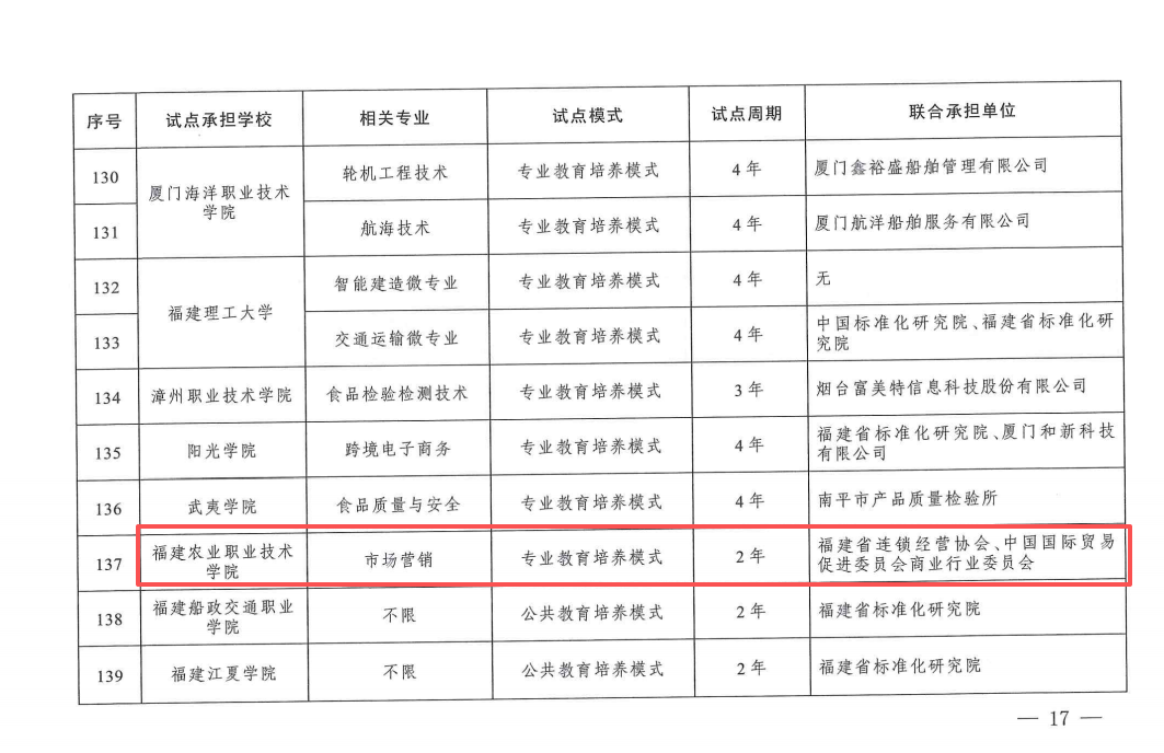 近日,国家市场监督管理总局、教育部联合公布《关于专业与标准化教育融合试点名单的公示》,我院与福建省连锁经营协会、中国国际贸易促进委员会商业行业委员会联合申报的市场营销专业成功入选。