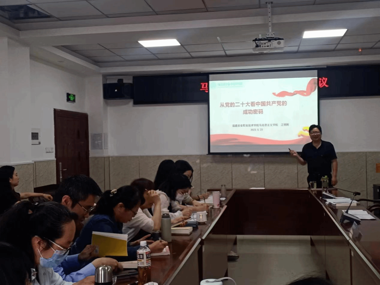 为全面学习贯彻党的二十大精神和习近平新时代中国特色社会主义思想,进一步引导党员教师牢固树立“四个意识”,坚定“四个自信”,深刻领悟“两个确立”,坚决做到“两个维护”,自觉从思想上政治上行动上与党中央保持高度一致。5月24日,马克思主义学院党支部书记江明辉为教师党员上了一堂《从党的二十大看中国共产党的成功密码》专题党课。