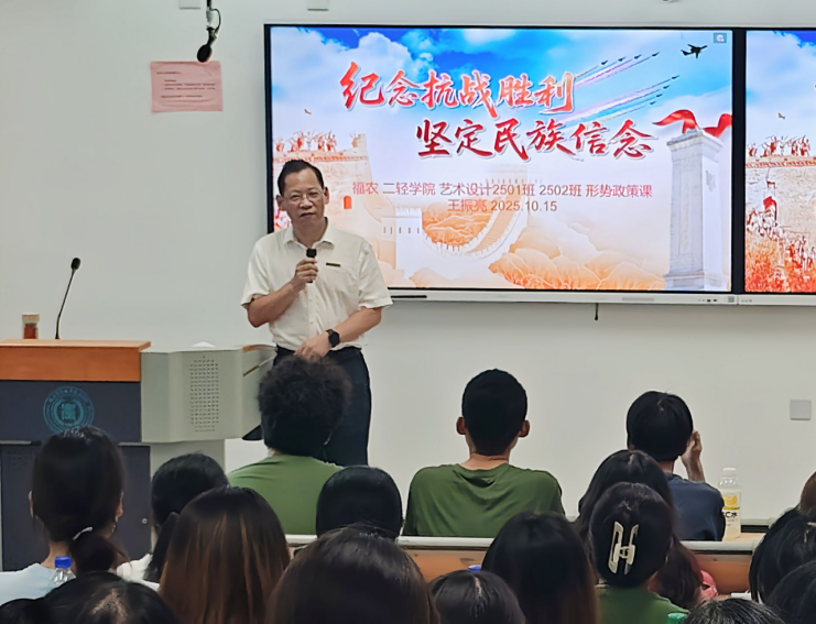 10月15日下午,学院党委副书记王振亮在动科楼603教室为二轻学院艺术设计2501、2502班学生讲授《纪念抗战胜利 坚定民族信念》专题思政课。