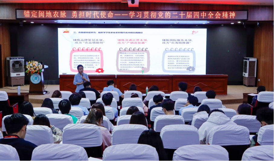 我校马克思主义学院精心组建了“学习贯彻党的二十届四中全会精神”“中国共产党人的精神谱系”“弘扬伟大抗战精神”等三支理论宣讲队,聚焦大中小学思政一体化联盟校、二级学院师生、团学干部、学生社团、高素质新型职业农民班学员等群体打造模块化、配送式的精准宣讲服务,累计开展党的二十届四中全会精神、中国共产党人精神谱系等主题宣讲45场,覆盖3000余人次。