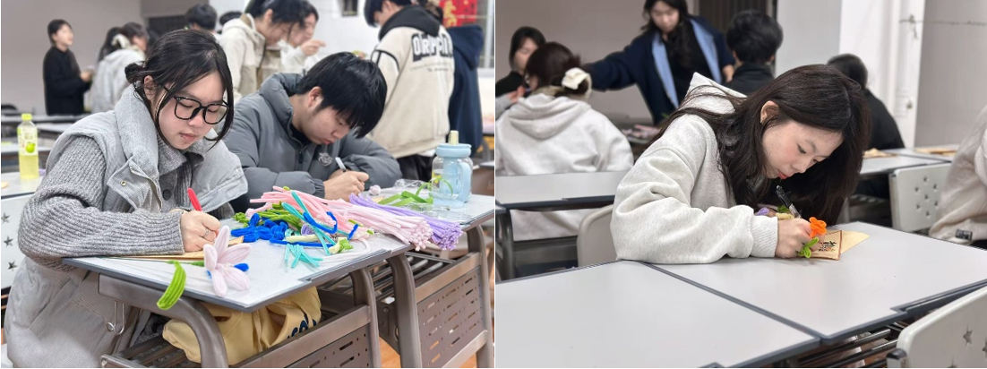 你以为传统文化只能是“老古董”?来“扭”转心情花漾治愈工坊看看吧!学员们拿起五颜六色的扭扭棒,尽情发挥创意,编织出寓意吉祥的郁金香、兰花等花卉造型。活动还特别设置了“三行情书·暖意传递”环节——学员们伏案执笔,有的写给未来的自己,寄托对成长的美好期许;有的写给远方的亲人,字里行间承载思念与祝福;还有的写给伟大的祖国,用真挚的语言表达“请党放心,强国有我”的青春誓言。