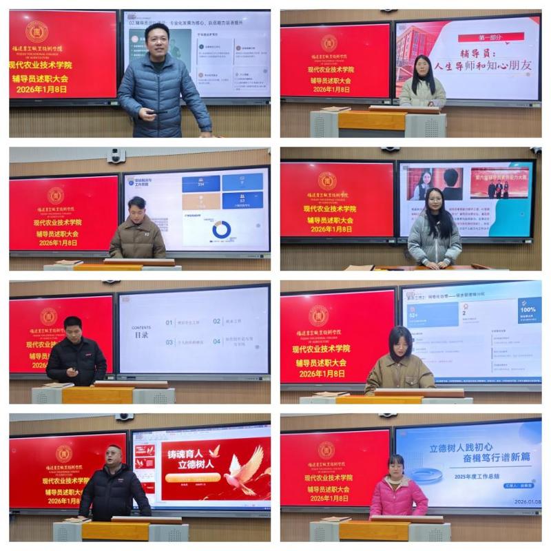 1月8日下午,现代农业技术学院在教(2)305教室召开2025年度辅导员述职会议。学院党总支书记欧高政、院长陈文胜、副院长冯冬林、党总支委员程晓琳及学生工作部学生管理科科长钟荣树参加会议。会议全面总结了过去一年学生工作取得的成效,深入交流辅导员队伍建设经验,研究探讨工作中存在的短板与对策,进一步推动学生工作提质增效和辅导员职业能力持续提升。