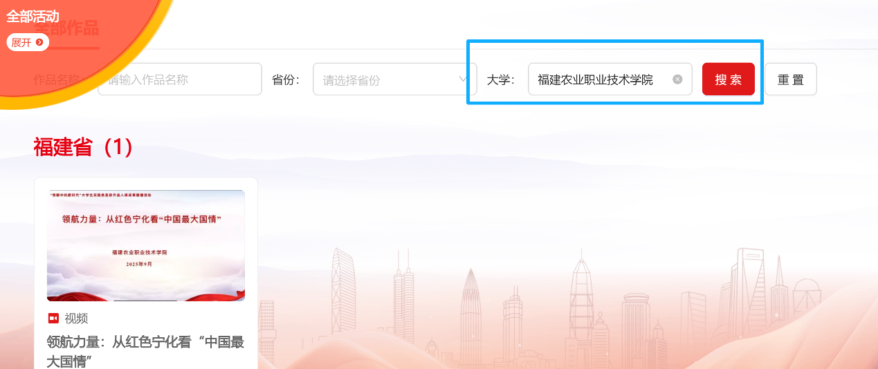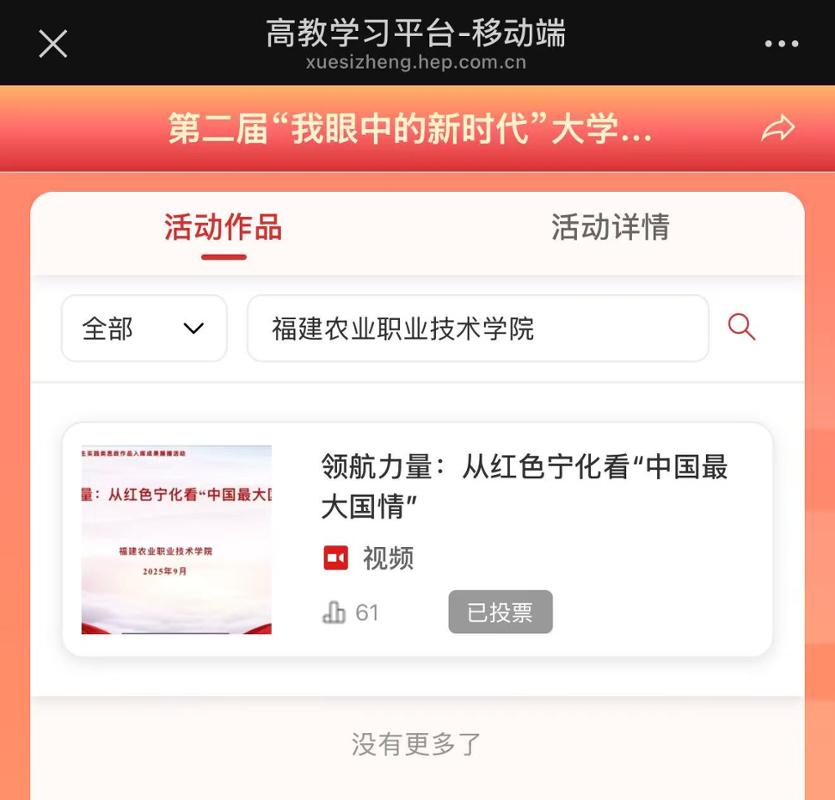 3.搜索栏中输入“福建农业职业技术学院”,选择《领航力量:从红色宁化看“中国最大国情”》,点击投票。