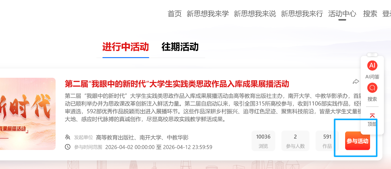3.选择《第二届“我眼中的时代”大学生实践类思政作品入库成果展播活动》,点击“参加活动”。