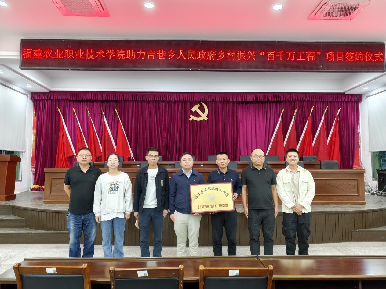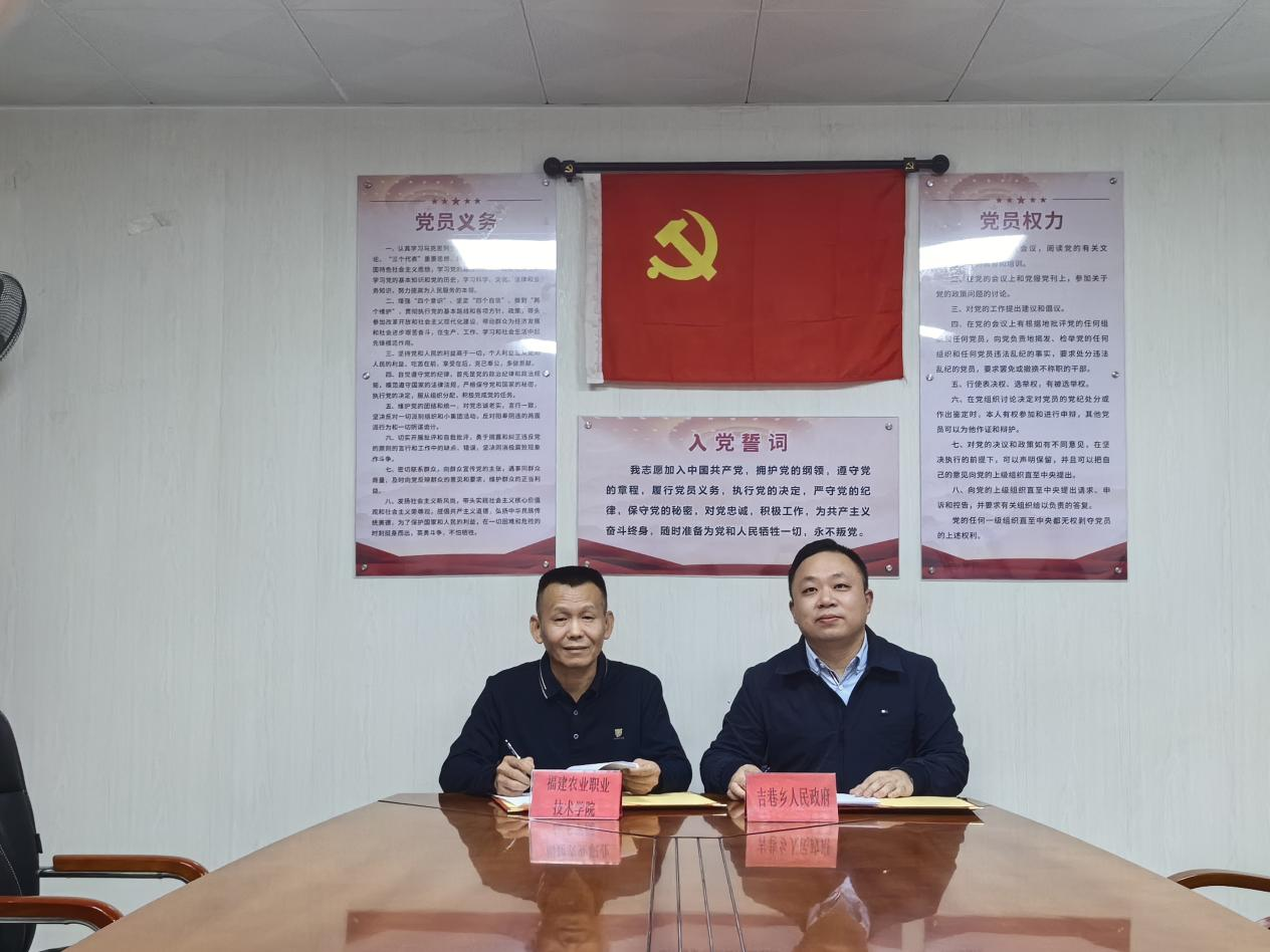 2025年10月27日,福建农业职业技术学院与古田县吉巷乡人民政府举行“百千万工程”项目授牌暨校地合作协议签约仪式。吉巷乡乡长钟平,现代农业技术学院院长陈文胜教授代表校地双方签订项目合作协议。省市场监督管理局挂村干部郭豪、副乡长陈小容、三级主任科员姚礼芳、乡综合执法大队长陈沛、现代农业技术学院钱笑杰博士等出席了此次授牌仪式。