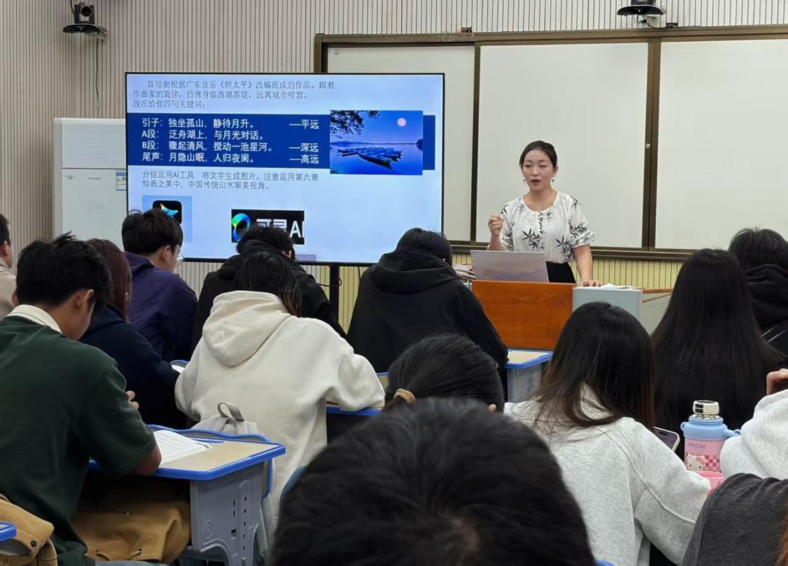 课堂的高潮出现在对演奏技巧与情感表达的剖析以及跨学科实践环节。李老师以《百鸟朝凤》为例,讲解了不同的“指触”如何在钢琴上实现清淡高远或灵敏颗粒的音色变化,并通过颤音、波音等装饰音,模仿唢呐的滑音和花舌音,准确生动地描绘出群鸟欢歌的画面。在探究器乐作品复杂的结构性时,李老师将艺术与前沿技术相结合,以《平湖秋月》为载体,设计了“AI协作、小组跨学科实践”活动。学生们被要求借助文生图AI应用,按照作品中引子、A段、B段、尾声所对应的“平远、深远、高远”等中国传统山水审美视角生成图片,实现了音乐、绘画与信息技术的深度融合与实践。