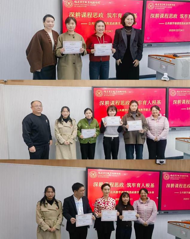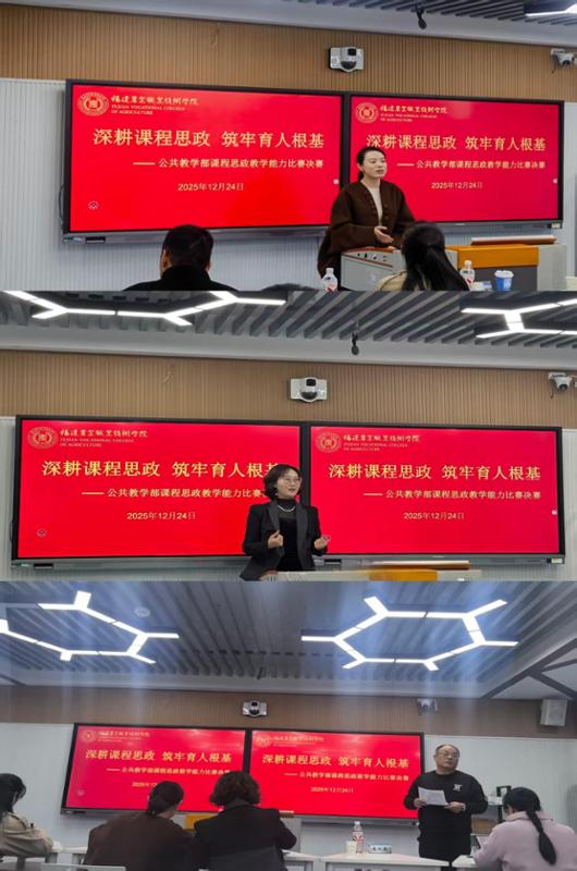 2025年12月24日下午,公共教学部在教学1号楼609教室举办课程思政教学比赛决赛。比赛共有13门课程参与,经初审,前8课程进入决赛。本次比赛特邀福建农林大学坚瑞教授、福建商学院卜新宇副研究员及本院吴礼光、黄琼、刘东兰三位教授担任评委,部门全体教师到场观摩。