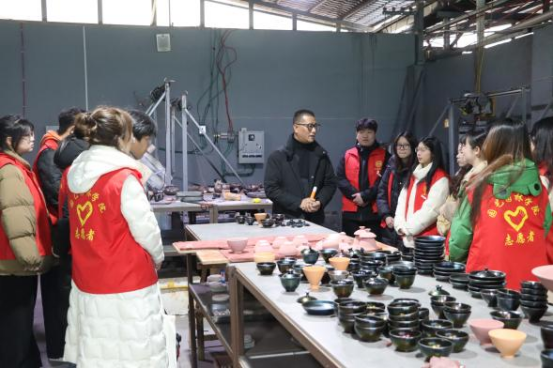 在潘盏柜建盏基地,省级非遗传承人潘贤森为实践团讲解了建盏“入窑一色,出窑万彩”的技艺奥秘。学生们亲身体验了拉坯、上釉等工序,并结合氧化还原反应原理,理解了“兔毫纹”“油滴斑”等纹理的形成机制。围绕建盏产业同质化现象,团队运用园艺、文旅等专业知识展开研讨,提出可通过“建盏+文旅”模式,为产品注入文化叙事,推动其向体验型文化产品转型。