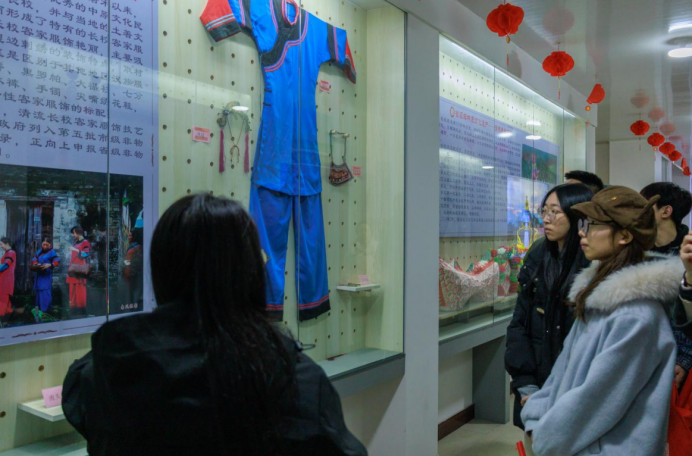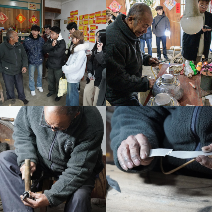 实践队先后到达清流县长校镇、嵩溪镇,系统调研“长校打锡”“客家服饰”“清流豆腐皮”等10余项省市级非遗项目,深入了解客家民俗的文化内涵。从欣赏客家服饰的独特纹样,领悟“蓝衫文化”的历史传承,到拜访童氏锡壶第七代传人童振光,见证一块锡板经历数万次锤击化作艺术器皿的匠心历程,再到走访“鑫珍”豆腐皮作坊,记录省级非遗十二道古法工序的精益求精。这些“一辈子只做一件事”的匠人故事,让同学们深刻理解了精益求精的工匠精神内涵。同学们纷纷表示,“从匠人身上看到了坚守非遗文化的魅力,我们青年一代要努力成为传统文化与现代生活的接力者,让优秀传统文化在新时代焕发更加璀璨的光彩。”