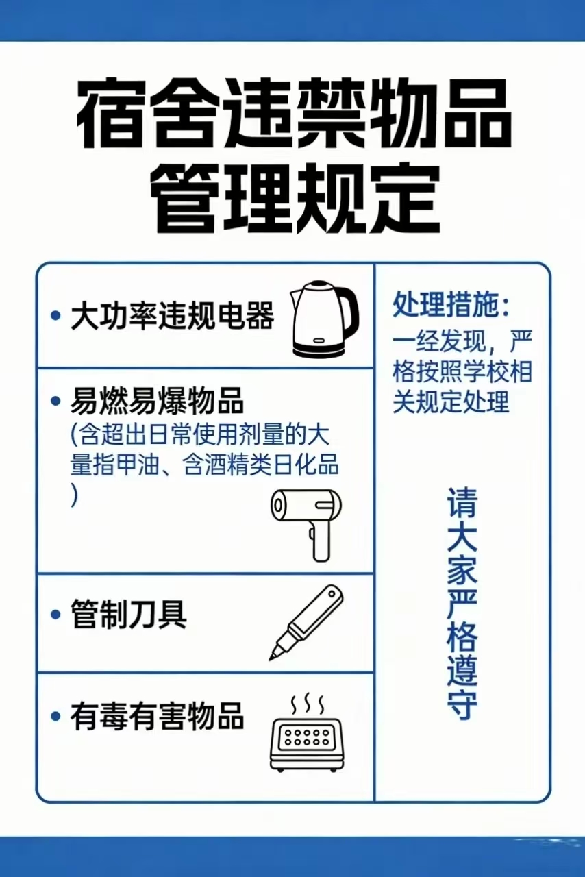 2.违禁物品,严禁存放:除大功率违规电器、易燃易爆物品(含超出日常使用剂量的大量指甲油、含酒精类日化品)外,严禁存放管制刀具、有毒有害物品等违禁物品,一经发现,将严格按照学校相关规定处理,请大家严格遵守。