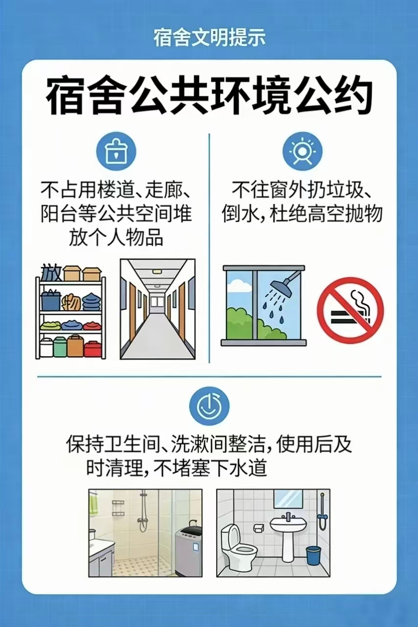 3.公共区域,共同守护:不占用楼道、走廊、阳台等宿舍公共空间堆放个人物品,不往窗外扔垃圾、倒水,杜绝高空抛物;保持卫生间、洗漱间整洁,使用后及时清理,不堵塞下水道,为彼此营造舒适的公共环境。