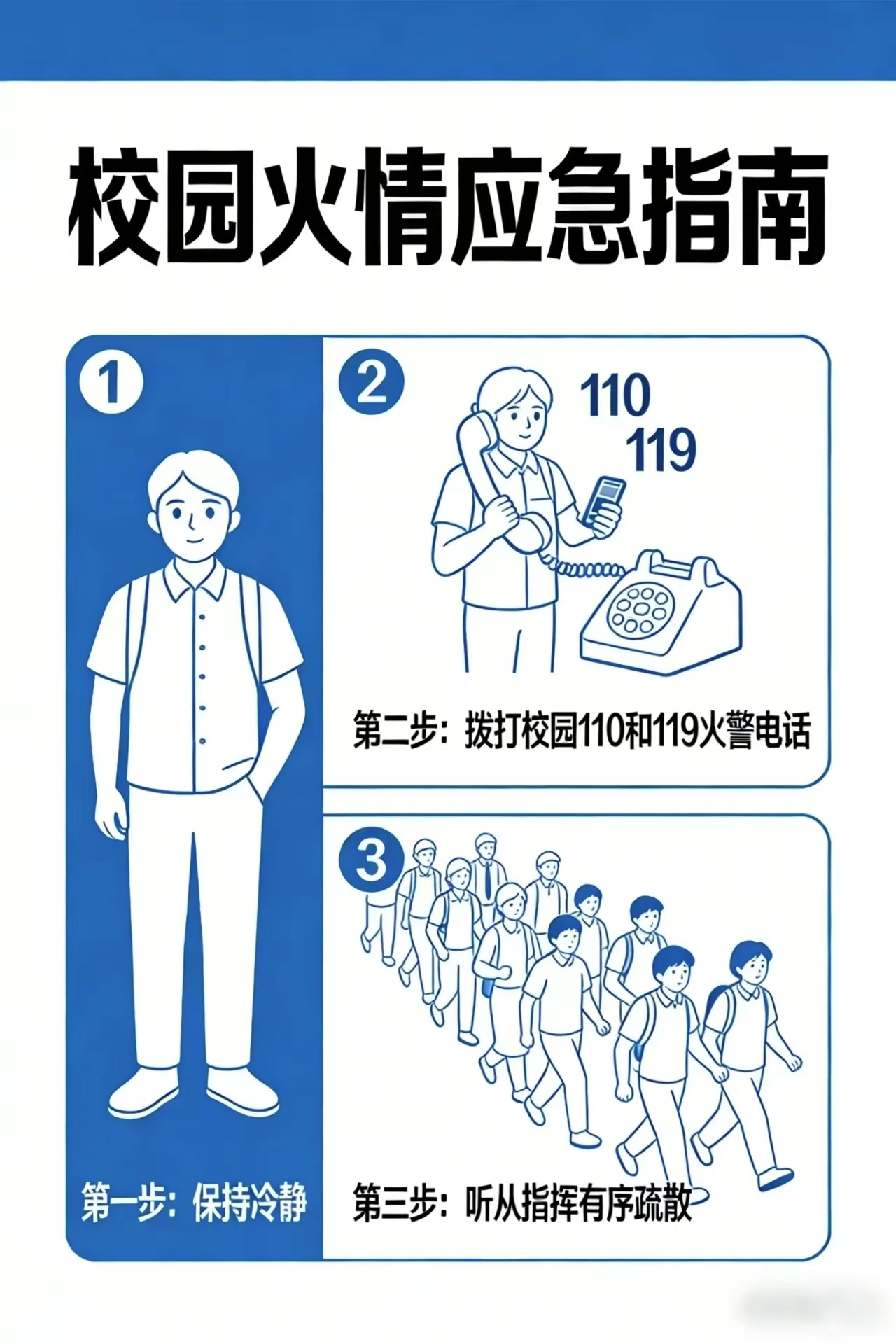 2.消防安全,警钟长鸣:严禁在宿舍内吸烟、点蜡烛、焚烧杂物,严禁存放酒精、汽油、打火机气罐等易燃易爆物品;请牢记宿舍楼道内灭火器、消防栓的位置及使用方法,不占用、堵塞消防通道,不遮挡消防设施;若遇火情,保持冷静,第一时间拨打校园110报警电话和119火警电话,听从指挥有序疏散。