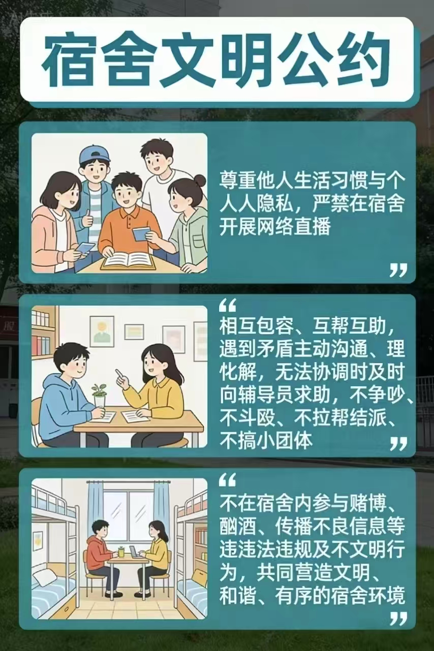 3.文明相处,友善互助:与室友友好相处,尊重他人生活习惯与个人隐私,严禁在宿舍开展网络直播;相互包容、互帮互助,遇到矛盾主动沟通、理性化解,无法协调时及时向辅导员求助,不争吵、不斗殴、不拉帮结派、不搞小团体;不在宿舍内参与赌博、酗酒、传播不良信息等违法违规及不文明行为,共同营造文明、和谐、有序的宿舍环境。