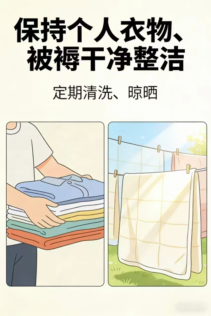 2.个人卫生,做好防护:保持个人衣物、被褥干净整洁,定期清洗、晾晒;牙刷、毛巾、水杯等个人生活用品单独摆放,不混用,避免交叉感染;每天开窗通风1-2次,每次不少于30分钟,保持宿舍内空气流通,守护大家的身体健康。