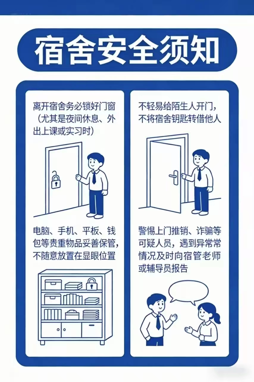 3.财产安全,提高警惕:离开宿舍务必锁好门窗(尤其是夜间休息、外出上课或实习时),电脑、手机、平板、钱包等贵重物品妥善保管,不随意放置在显眼位置;不轻易给陌生人开门,不将宿舍钥匙转借他人,警惕上门推销、诈骗等可疑人员,遇到异常情况及时向宿管老师或辅导员报告。