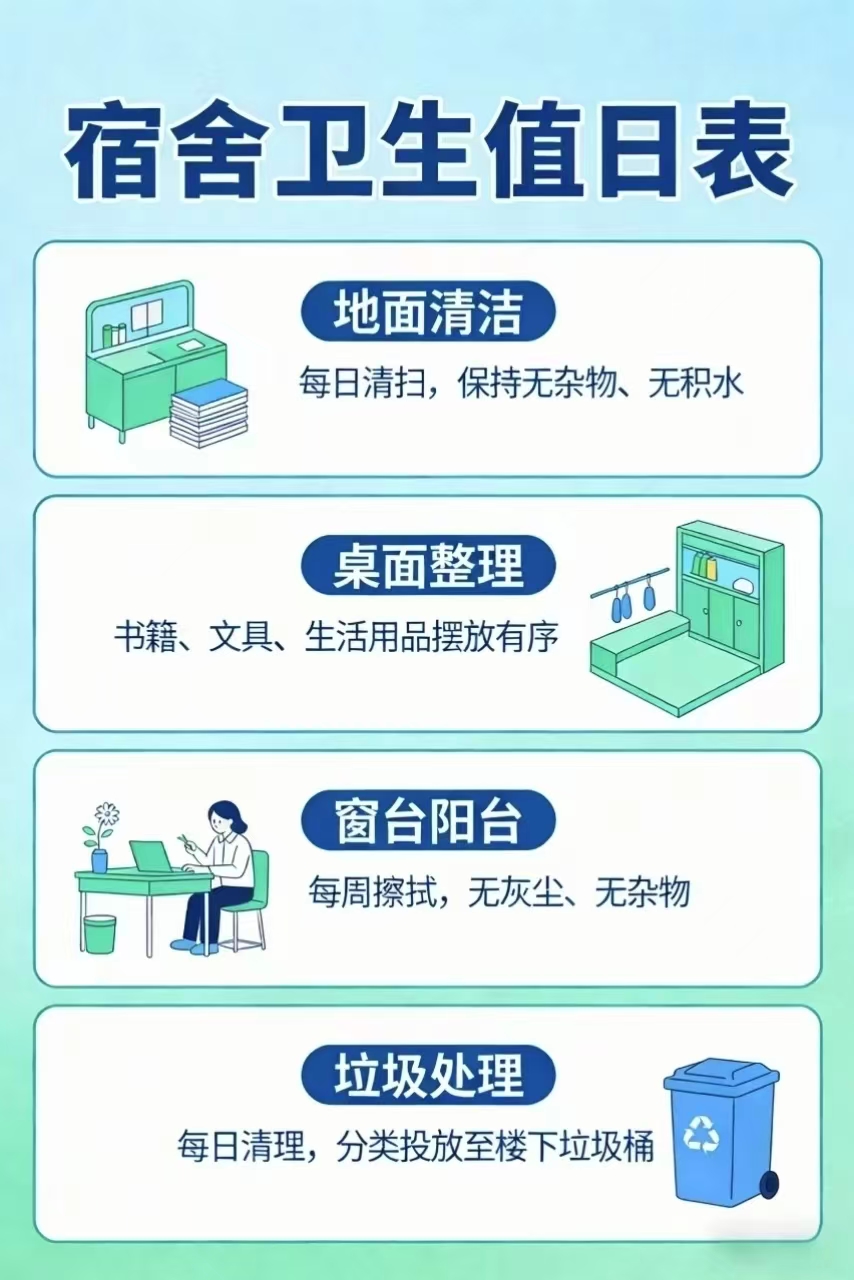 干净整洁的宿舍环境,既能提升居住舒适度,也能减少疾病滋生,需要全体室友分工协作、共同维护,让“小家”始终干净清爽: