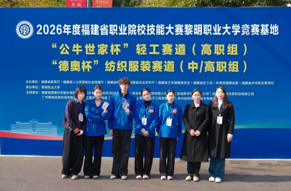 2026年福建省职业院校技能大赛纺织服装赛道于1月17日-18日在黎明职业大学举行,来自全省14所院校的25支参赛队伍同台竞技。我院由柴婷婷、解春辉两位老师指导,李宁丹、李博恺、骆宸佳、赖俊慧四位同学组成的代表队,在比赛过程中团结协作,围绕产品市场痛点,从新材料、新工艺、新功能三个方面针对性解决问题,充分展示了我院学子过硬的职业技能和扎实的专业素养,得到评委的肯定和好评,以总分第3名的好成绩荣获大赛铜奖。